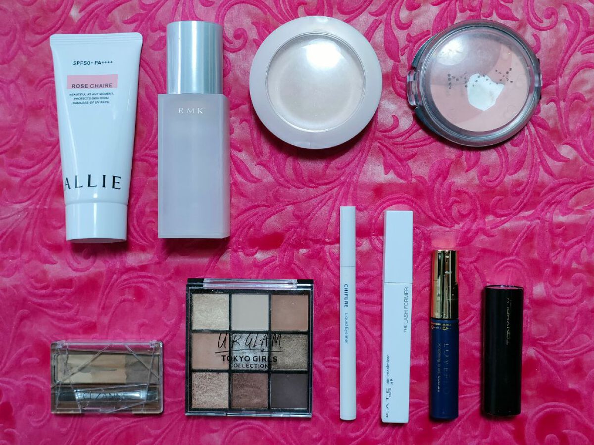 アリィー ニュアンスチェンジUV ジェル RSを、顔全体にまんべんなく塗ります。 RMK RMK ジェルクリーミィファンデーション 103を、顔全体にまんべんなく塗ります。 ジョンソンベビー ジョンソン ベビーパウダーを、顔全体にまんべんなく軽くはたきます。 THE BODY SHOP bronze shade warm glowを、両頬に塗ります。 KATE リフレクトミラーアイズ BR-1の締め色を、眉毛全体にまんべんなく塗ります。 URGLAM UR GLAMBLOOMING EYE COLOR PALETTE 01を、使用しました。 ちふれ リキッド アイライナー 筆ペンタイプ BK30 ブラックを、塗ります。 CEZANNE エアリーカールマスカラを、まつ毛全体にまんべんなく塗ります。 MAYBELLINE NEW YORK コロッサルボリュームエクスプレスを、まつ毛全体にまんべんなく塗ります。 MAYBELLINE NEW YORK SPステイ マットインク 135を、唇全体にまんべんなく塗ります。