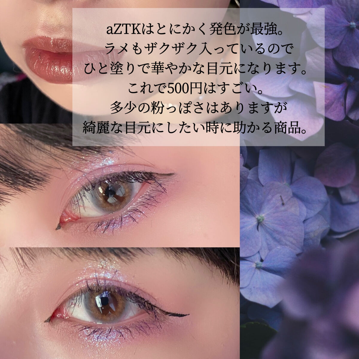 aztkのお化粧品になります(⁎ᴗ͈ˬᴗ͈⁎)🍀*゜パープルはぶたん紫やピンクラメ真ん中まぶたに塗るようにしています確かドンキで購入したような気もしますが他のaztkはイオンモールで購入しました🫣1つ100円だったので普通の金額よりも格安で発...