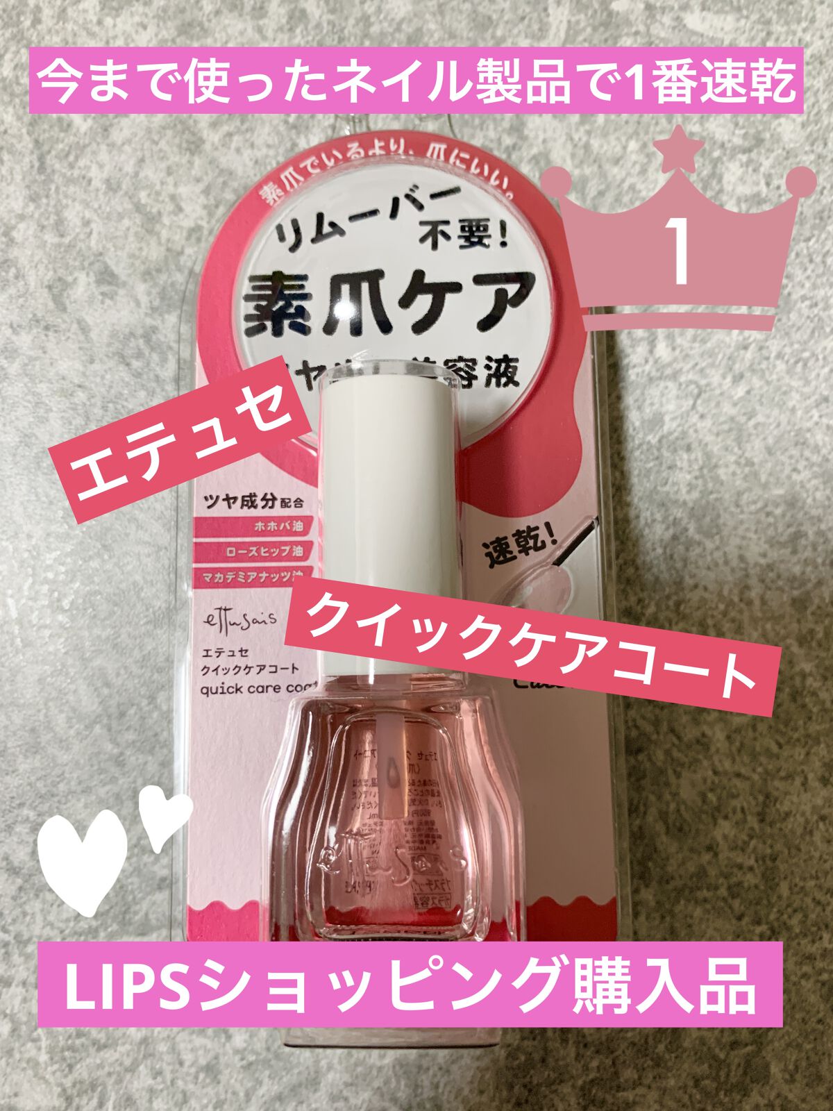 - 素爪でいるより、爪にいい。速乾!リムーバーいらず!透明薄膜ヴェールで爪を保護&ケアする、ツヤ出しネール用美容液。 弱い爪を摩擦や乾燥から保護し、爪のカケ・割れ・二枚爪・乾燥を防ぎます。 塗布すると、エッセンスコート成分が均一な薄膜をつくり、ナチュラル光沢成分&植物オイル(*)が自然なツヤを与えます。 ほんのりピンク色で、爪磨きしたようなナチュラルなツヤ仕上げです。 トルエンフリー、無香料で爪へのやさしさを配慮。 通常のトップコートやハードナーは、一部はがれると、厚みがあるため、凹凸になりますが、「クイックケアコート」は、厚みのない薄膜仕上げなので、落とさず、上から塗布してもキレイになじむので、リムーバーいらずです。 *ホホバ油・ローズヒップ油・マカデミアナッツ油 <こんな時におすすめ> ・爪を保護しながらツヤも出るので、マニキュアをお休みしたい時に ・超速乾だからササッと簡単にケアしたい時に ・ナチュラルなツヤ、仕事上ネールNGでもキレイに見せたい時に 【価格改定について】 いつもご愛用いただきありがとうございます。 この度、原材料高騰などにより、2025年9月1日より、希望小売価格の変更を行うこととなりました。 何卒ご理解を賜わりますよう、心よりお願い申し上げます。 エテュセ クイックケアコート 旧価格 税込1,045円(税抜950円) ↓ 新価格 税込1,265円(税抜1,150円)