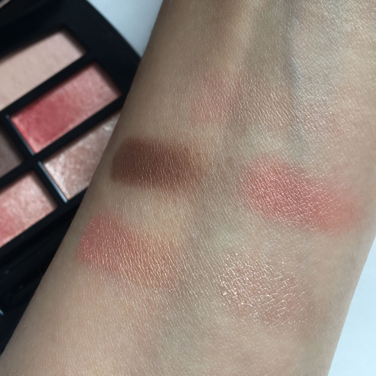 全体的に淡い色出しの中、ポイントになるのは右下のトップコート。他のカラーに重ねるとぐっと奥行きが出ます。 「328」は当初購入候補ではありませんでしたが、実際に触って、試してみるとモーヴ好きにはたまらないパレットで即決でした!