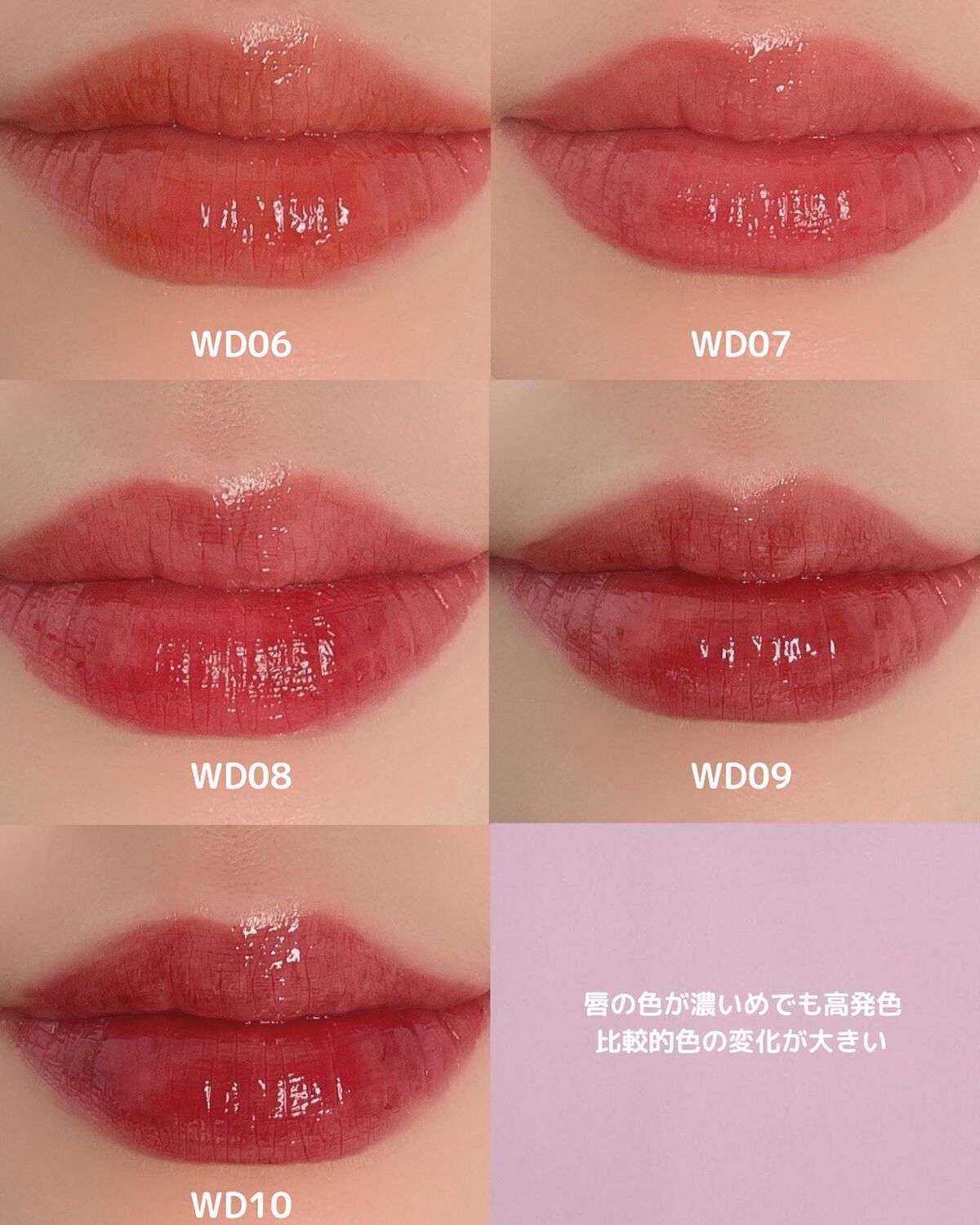 - <WD2 ビトゥン ローズ> 水、ジフェニルジメチコン、リンゴ酸ジイソステアリル、ビスジグリセリルポリアシルアジペート-2、水添ポリイソブテン、ジグリセリン、DPG、セチルPEG/PPG-10/1ジメチコン、イソステアリン酸ソルビタン、ポリソルベート60、ペンチレングリコール、オクチルドデカノール、セテアレス-20、(アクリル酸ヒドロキシエチル/アクリロイルジメチルタウリンNa)コポリマー、スクワラン、フェノキシエタノール、ポリグリセリン-3、ステビオシド、香料、エチルヘキシルグリセリン、グリセリン、シア脂、ツバキ種子油、トリ(カプリル酸/カプリン酸)グリセリル、アルガニアスピノサ核油、ホホバ種子油、アーモンド油、アンズ核油、月見草油、オリーブ果実油、テトラ(ジ-t-ブチルヒドロキシヒドロケイヒ酸)ペンタエリスリチル、カニナバラ果実エキス、マンゴー果実エキス、赤104(1)、赤227、黄5、青1 <WD3 ピンク ヘイズ> 水、ジフェニルジメチコン、リンゴ酸ジイソステアリル、ビスジグリセリルポリアシルアジペート-2、水添ポリイソブテン、ジグリセリン、DPG、セチルPEG/PPG-10/1ジメチコン、イソステアリン酸ソルビタン、ポリソルベート60、ペンチレングリコール、オクチルドデカノール、セテアレス-20、(アクリル酸ヒドロキシエチル/アクリロイルジメチルタウリンNa)コポリマー、スクワラン、フェノキシエタノール、ポリグリセリン-3、ステビオシド、香料、エチルヘキシルグリセリン、グリセリン、水酸化Al、ポリアクリル酸アンモニウム、BG、アルガニアスピノサ核油、シア脂、ツバキ種子油、トリ(カプリル酸/カプリン酸)グリセリル、アーモンド油、アンズ核油、ホホバ種子油、月見草油、オリーブ果実油、テトラ(ジ-t-ブチルヒドロキシヒドロケイヒ酸)ペンタエリスリチル、マンゴー果実エキス、カニナバラ果実エキス、酸化チタン、赤104(1)、赤227、黄5、青1 <WD4 オールウェイズ ヤング> 水、ジフェニルジメチコン、リンゴ酸ジイソステアリル、ビスジグリセリルポリアシルアジペート-2、水添ポリイソブテン、ジグリセリン、DPG、セチルPEG/PPG-10/1ジメチコン、イソステアリン酸ソルビタン、ポリソルベート60、ペンチレングリコール、オクチルドデカノール、セテアレス-20、(アクリル酸ヒドロキシエチル/アクリロイルジメチルタウリンNa)コポリマー、スクワラン、フェノキシエタノール、ポリグリセリン-3、ステビオシド、香料、エチルヘキシルグリセリン、グリセリン、シア脂、ツバキ種子油、トリ(カプリル酸/カプリン酸)グリセリル、アルガニアスピノサ核油、ホホバ種子油、アーモンド油、アンズ核油、月見草油、オリーブ果実油、テトラ(ジ-t-ブチルヒドロキシヒドロケイヒ酸)ペンタエリスリチル、カニナバラ果実エキス、マンゴー果実エキス、赤104(1)、赤227、黄5、青1 <WD6 クラッシュド パンプキン> 水、水添ポリイソブテン、リンゴ酸ジイソステアリル、ビスジグリセリルポリアシルアジペート-2、ジフェニルシロキシフェニルトリメチコン、ジフェニルジメチコン、ポリグリセリン-3、オクチルドデカノール、ポリソルベート60、セチルPEG/PPG-10/1ジメチコン、ラウリン酸ポリグリセリル-10、ペンチレングリコール、1,2-ヘキサンジオール、(アクリル酸ヒドロキシエチル/アクリロイルジメチルタウリンNa)コポリマー、PEG-60水添ヒマシ油、セテアリルアルコール、スクワラン、キシリトール、エチルヘキシルグリセリン、香料、ポリアクリル酸アンモニウム、イソステアリン酸ソルビタン、水酸化Al、フェノキシエタノール、BG、トコフェロール、酸化チタン、酸化鉄、赤227、黄4、黄5、青1 <WD8 ビンテージ カラント> 水、水添ポリイソブテン、リンゴ酸ジイソステアリル、ビスジグリセリルポリアシルアジペート-2、ジフェニルシロキシフェニルトリメチコン、ジフェニルジメチコン、オクチルドデカノール、ポリグリセリン-3、ポリソルベート60、セチルPEG/PPG-10/1ジメチコン、ラウリン酸ポリグリセリル-10、1,2-ヘキサンジオール、ペンチレングリコール、(アクリル酸ヒドロキシエチル/アクリロイルジメチルタウリンNa)コポリマー、PEG-60水添ヒマシ油、セテアリルアルコール、スクワラン、キシリトール、エチルヘキシルグリセリン、香料、イソステアリン酸ソルビタン、トコフェロール、赤104(1)、赤227、黄5、青1 <WD9 ミスター ストレンジャー> 水、水添ポリイソブテン、リンゴ酸ジイソステアリル、ビスジグリセリルポリアシルアジペート-2、ジフェニルシロキシフェニルトリメチコン、ジフェニルジメチコン、オクチルドデカノール、ポリグリセリン-3、ポリソルベート60、セチルPEG/PPG-10/1ジメチコン、ラウリン酸ポリグリセリル-10、1,2-ヘキサンジオール、ペンチレングリコール、(アクリル酸ヒドロキシエチル/アクリロイルジメチルタウリンNa)コポリマー、セテアリルアルコール、PEG-60水添ヒマシ油、スクワラン、キシリトール、エチルヘキシルグリセリン、香料、イソステアリン酸ソルビタン、水酸化Al、ポ
