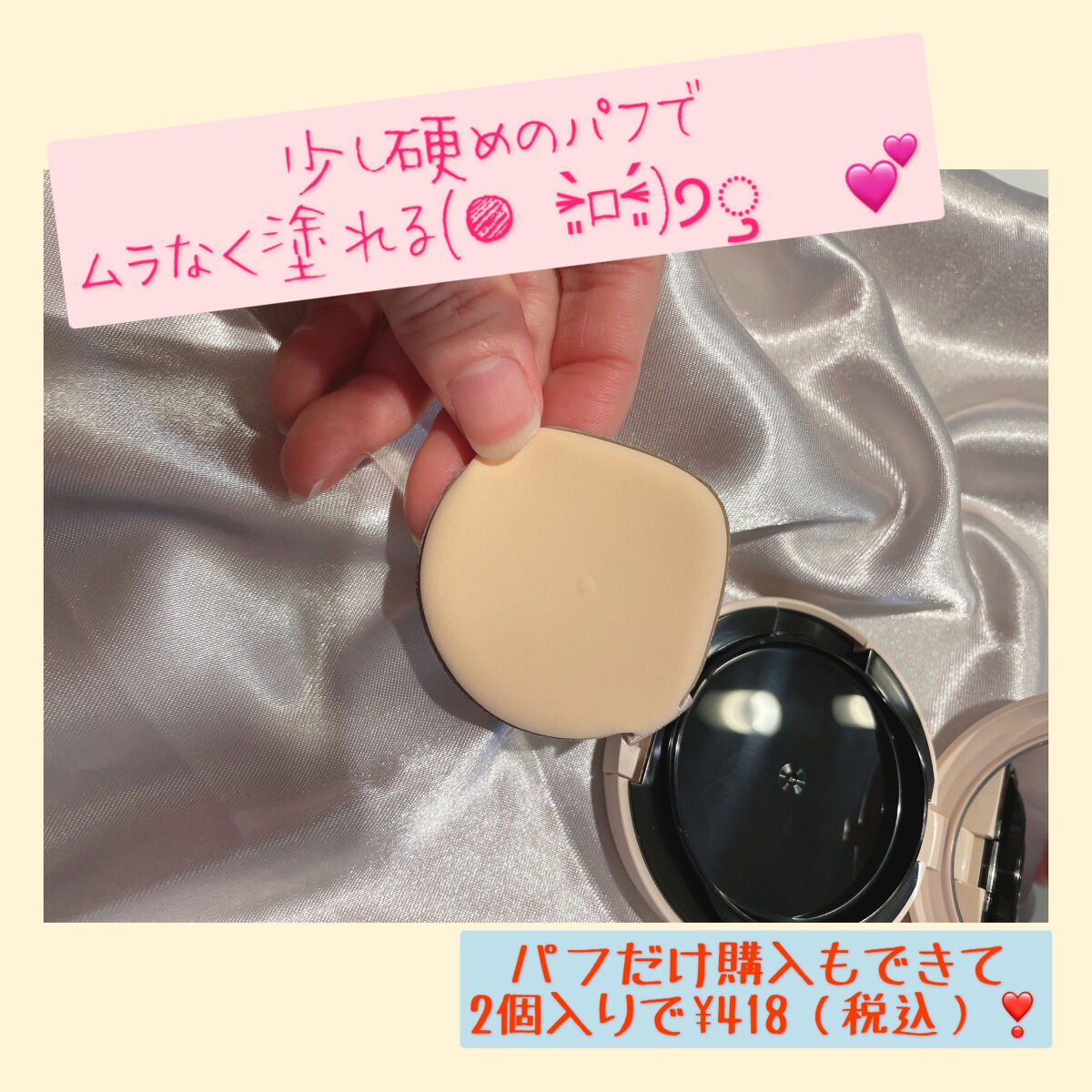 毛穴、赤みをカバーしてくれて、肌のトーンを均一にしてくれます(*≧∀≦*) カバー力バッチリ(*´∇`*)❗️❗️ パッケージも黒でとっても可愛い❤️❤️ パフも7角形❗️∑(゚Д゚) 初めて見ました(*'▽'*) 使ってみると、小鼻の塗り忘れ、目の所もとっても使いやすかったです(*´∀`*) 香りも甘〜いバニラ?のような香りで美味しそう(*´Д`*)笑笑 サラッとした仕上がりのセミマットクッションファンデーションです(o^^o) ただ、塗った後、マスクを付けて1時間もしないうちにヨレが(´;Д;`) 仕事柄良くしゃべります💦💦 元々ニキビ跡もあるので、毛穴落ちはどのファンデーションでも多少あるのですが… 鼻の所が……ヨレが汚いです(´;Д;`) (マスクが一番当たる所だからかな…) また、シワはあまりないはずなのですが、表情の使い方?マスクの当たり具合?によっては、面白い謎のヨレ?跡?シワ?が…((((;゚Д゚))))))) その点で⭐︎マイナス1です(´;Д;`)すみません。 持ち運びに便利なので、メイク直し用に使いたいと思います(*^^*)