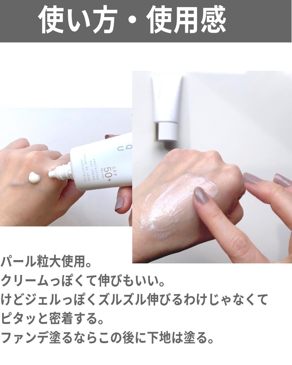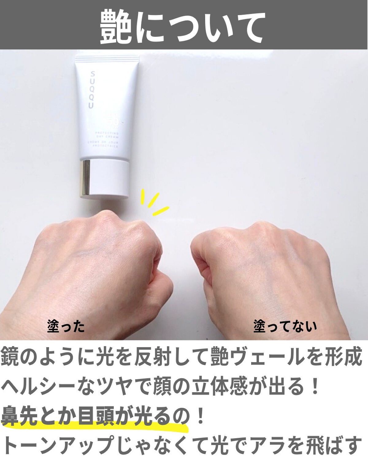 - SPF50+・PA++++ ベースメイクの仕上がりを高め、表情まで活き活きと見せるなめらかな艶のヴェール。 日中の肌を長時間うるおいで満たし続けるスキンケアクリームのような心地良さ。 日焼け止めを塗ることが義務ではなく、むしろすすんで手にとりたくなる。 そんなUVクリームの誕生です。 紫外線のみならず、肌表面に花粉やほこりなどの微粒子汚れが付着するのを物理的に防ぎながら※1 、光を味方につけてSUQQUらしい艶肌へと導きます。 ※1 乾燥、花粉やほこりなどの微粒子汚れ。すべての微粒子汚れの付着を防ぐわけではありません。