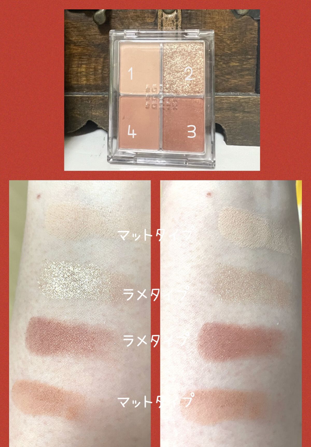 - ★オンオフ問わずマルチに活躍「4色アイシャドウ」 これ一つあれば誰でも簡単に旬の目元になれる、トレンド感のあるニュアンスカラーが4色入ったアイシャドウパレット。4色のつけ方を変えるだけで、何通りもの印象の異なるメイクを楽しむことができます。