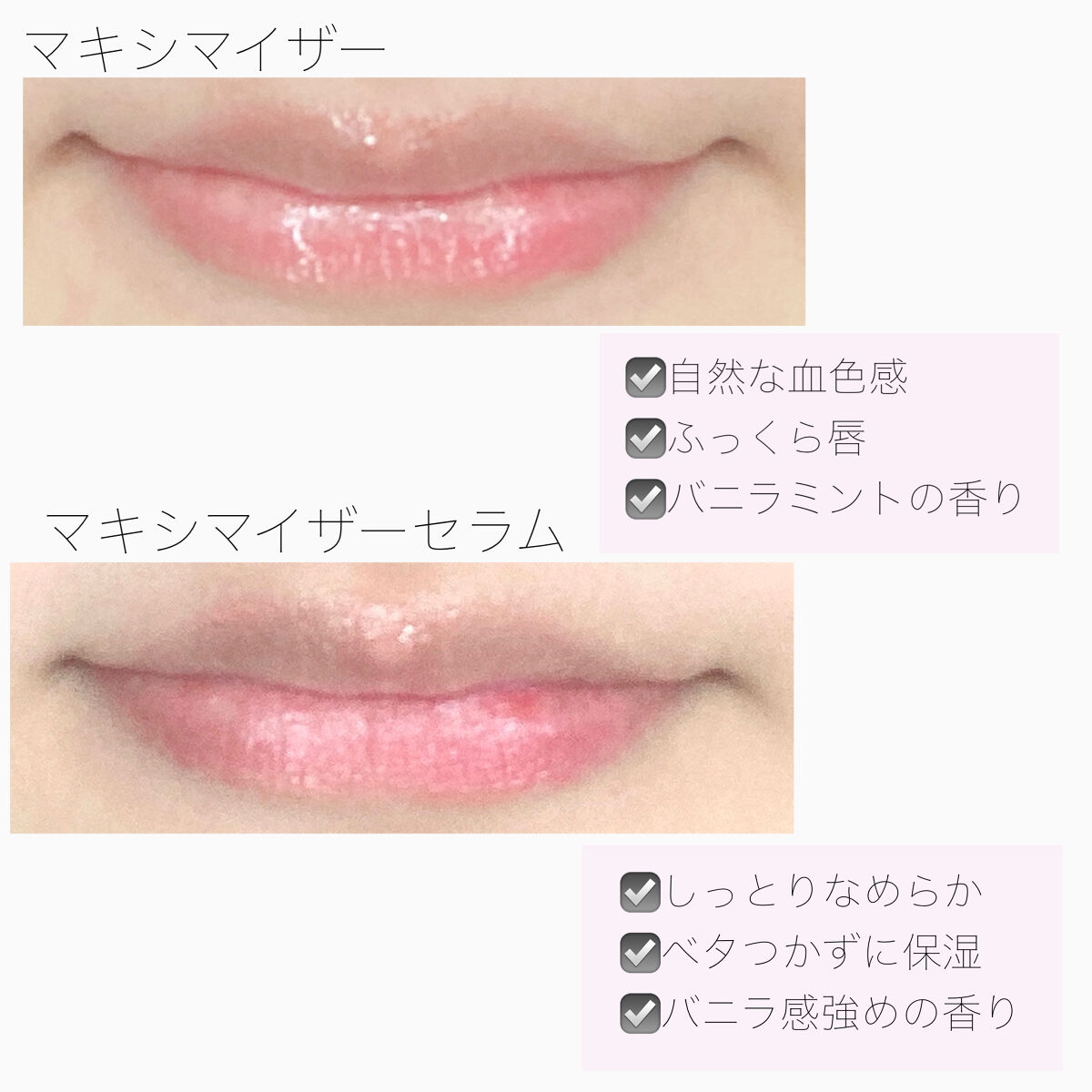 ・リップだけじゃなくチークとしても使える・ふわふわした質感で発色も柔らかい・マットな仕上がりだけど乾燥しにくい・リップのベースカラーにも◎・バニラのような甘い香り ・高密着なのにあまりベタつかない・プランパー効果もあり、ふっくらしたプルツヤ唇に(スースー感ありピリピリ感はほぼ無し)・石鹸のような香り ・セミマットな仕上がりで乾燥しにくい・なめらかな質感で縦じわの改善○・こちらもプランパー効果あり(ピリピリ感なしのスースー感あり)・石鹸のような香り ・うるうるちゅるんとした唇に・ナチュラルなオレンジブラウンカラー・薄付きでちょうどいい発色 ・セミマットな仕上がりで乾燥しにくい・しっかり濃いめの発色で色持ちも良い・なめらかな質感・バニラのような甘い香り ・ふわふわした質感と仕上がり・マットなのに乾燥しにくい・発色が良い・甘い香り