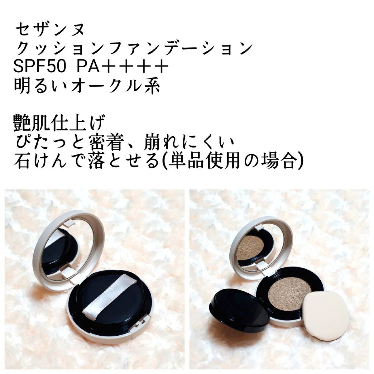 - <本体> 薄膜がぴたっと密着し艶肌続くクッションファンデ。 シミ・毛穴・色ムラをカバーしてお肌にぴたっと密着しメイク崩れしにくい。 5種の保湿成分(スクワラン、セラミドNP、ベルガモット果実エキス、ヒアルロン酸Na、アーチチョーク葉エキス)と高保湿オイルを配合。 重ねても厚塗りになりにくく、まるでお肌の内側から潤ったような艶肌仕上げ。 SPF50 PA++++。 石鹸で落とせます。(※単品使用の場合) <パフ> セザンヌのクッションファンデーションに使える替パフ2個入。 広い面や細部までも使いやすいしずく型パフで、ファンデーションをムラなくきれいに仕上げます。 クッション面にパフを押し当て、ファンデーションを適量とり、軽くたたくようにお肌に塗布してください。 ※汚れたときは、うすめた台所用中性洗剤で軽く押し洗いをし、よく洗い流してください。その後水気を切り、陰干ししてください。