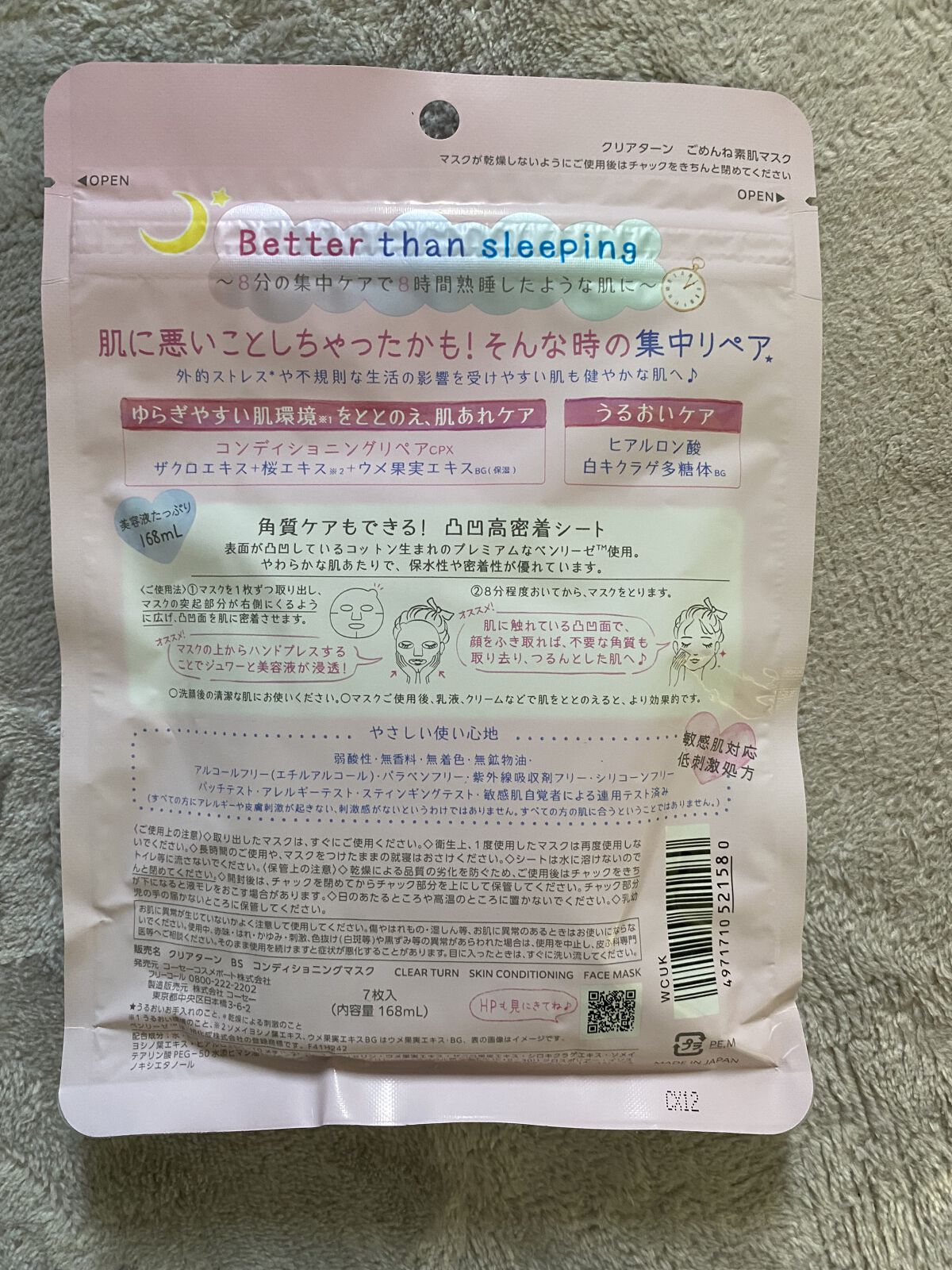 - 【クリアターン ごめんね素肌マスク】 負担をかけて、あれてしまった肌の素肌環境※1をととのえる“速攻集中リペア※2マスク”です。 ① あれがちな肌を素早くコンディションケア! ザクロエキス、桜エキス※3、ウメ果実エキスBG配合し、ゆらぎやすい肌環境をととのえ、肌あれをケアします。また、うるおいケア成分として、ヒアルロン酸、白キクラゲ多糖体BGを配合。外的ストレス※4や不規則な生活の影響を受けやすい肌も健やかでゆらぎにくい肌へみちびきます。 ②敏感肌も使える、弱酸性・低刺激処方 無香料・無着色・無鉱物油・アルコールフリー(エチルアルコール)・パラベンフリー・紫外線吸収剤フリー・シリコーンフリー・パッチテスト済み・アレルギーテスト済み・スティンギングテスト済み・敏感肌自覚者による連用テスト済み(すべての方にアレルギーや皮膚刺激が起きない、刺激感がないというわけではありません。すべての方の肌に合うということではありません。) ③角質ケアもできる!凸凹高密着シート コットン生まれのやわらかな肌触りのベンリーゼを使用。 表面に凸凹のエンボス加工を施しているため、密着性が高く、はがしたマスクでやさしく顔をふきとることで角質ケアもできます。 ※1 うるおい環境のこと ※2 うるおいお手入れのこと ※3 ソメイヨシノ葉エキス、ウメ果実エキスBGはウメ果実エキス・BG(保湿) ※4 乾燥による刺激のこと