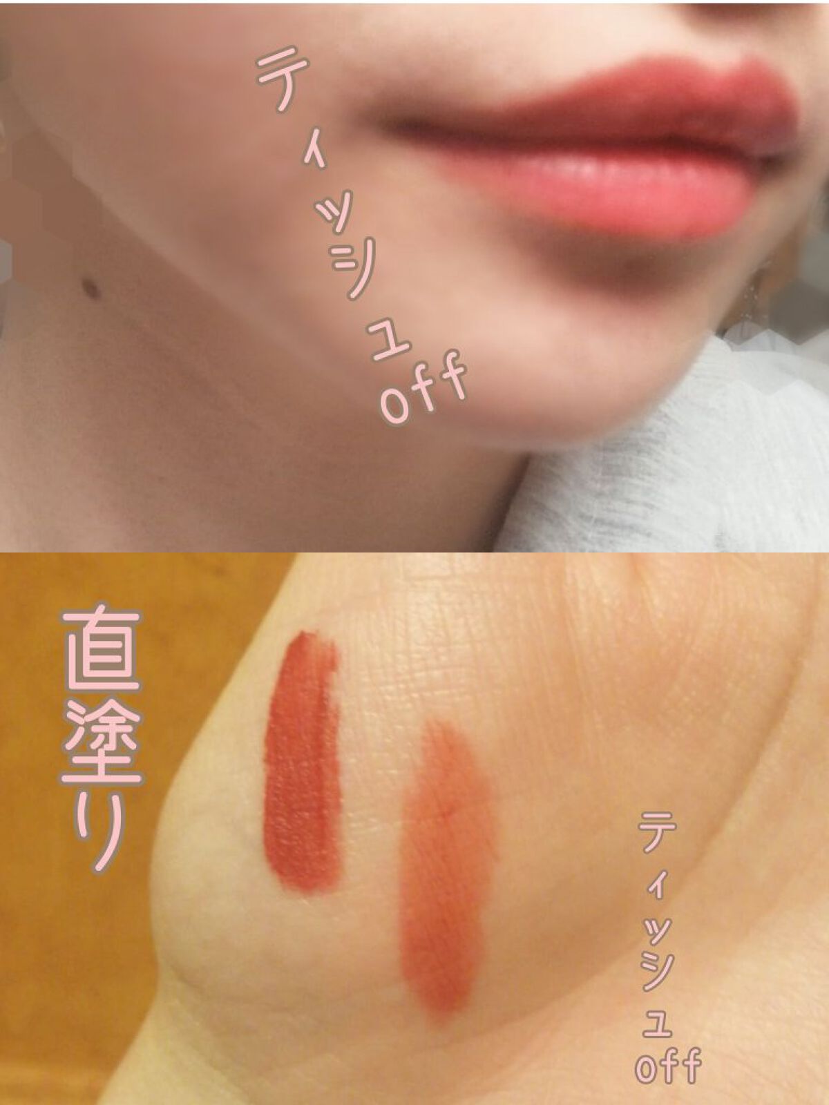 最後の写真では少しオレンジ感が強いんですけど発色は赤です。 単体で使うのもありだと思うんですけど、私はトーンの違う色味を使って深みを出す方が好きですね。 色落ちもしにくくマスクにもつかないですし、ファンデーションでトーンアップさせた肌色によく映えるなと思ってずーっと使ってます笑