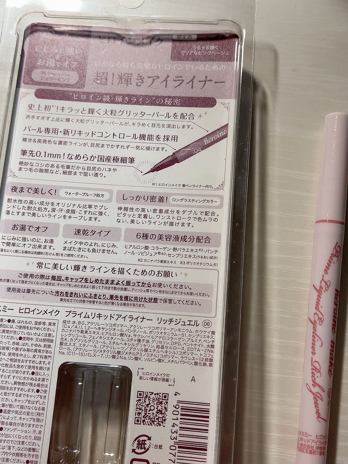 - 派手過ぎず上品に輝く大粒のグリッターパールが、キラめく目元を演出! 夜まで落とさない 超!輝きアイライナーが数量限定で登場 ■史上初※1!キラっと輝く 大粒グリッターパールを配合 派手すぎず上品に輝く大粒グリッターパールが、キラめく目元を演出! ※1ヒロインメイク 筆ペンライナー内で。 ■パール専用・新リキッドコントロール機能を採用 輝き&高発色な濃密ラインが、目尻までかすれずに一気に描けます。 ■筆先0.1mm!なめらか国産極細筆 絶妙なコシのある毛筆だから目尻のハネやまつ毛の隙間など、細部まで狙い通り。 ■夜まで美しく!ウォータープルーフ処方 耐久性の高い成分をオリジナル比率でブレンドした耐久処方。 涙・汗・皮脂・こすれに強く、落とすまで美しいラインをキープします。 ■濃密&高発色!ロングラスティングカラー 伸縮性の高い密着成分をダブルで配合。ピタッと定着し、ワンストロークで色ムラのない、濃密&高発色なラインが描けます。 ■にじまないのにお湯でオフ にじみに強いのに、お湯で簡単にオフ出来ます。 *落ちにくく感じる場合は洗顔料(石けん等)をご使用ください。 ■抜群の速乾性 速乾性に優れ、メイク中のよれ、にじみに、まばたきにも負けません。 ■6種類の美容液成分配合 ・ヒアルロン酸 ・コラーゲン ・野バラエキス※2 ・パンテノール ・リピジュア®※3 ・センブリエキス ※2 カニナバラ果実エキス ※3 ポリクオタニウム - 51