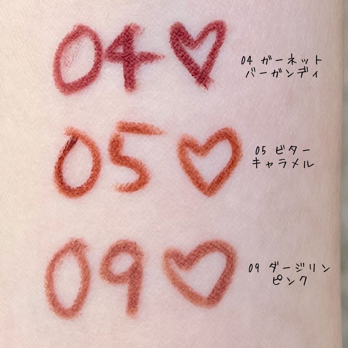 - <01 ディープブラック> メチルトリメチコン、トリメチルシロキシケイ酸、(アクリレーツ/アクリル酸ステアリル/メタクリル酸ジメチコン)コポリマー、ポリエチレン、カルナウバロウ、キャンデリラロウ、ジメチコン、水添レシチン、シリカ、メタクリル酸メチルクロスポリマー、トコフェロール、スクワラン、ホホバ種子油、マカデミア種子油、ヒアルロン酸Na、メチコン、(+/-)水酸化Al、酸化鉄、マイカ、酸化チタン <02 ミディアムブラウン> メチルトリメチコン、トリメチルシロキシケイ酸、(アクリレーツ/アクリル酸ステアリル/メタクリル酸ジメチコン)コポリマー、ポリエチレン、カルナウバロウ、キャンデリラロウ、ジメチコン、水添レシチン、シリカ、メタクリル酸メチルクロスポリマー、トコフェロール、スクワラン、ホホバ種子油、マカデミア種子油、ヒアルロン酸Na、メチコン、(+/-)水酸化Al、酸化鉄、マイカ、酸化チタン <03 ダークブラウン> メチルトリメチコン、トリメチルシロキシケイ酸、(アクリレーツ/アクリル酸ステアリル/メタクリル酸ジメチコン)コポリマー、ポリエチレン、カルナウバロウ、スクワラン、ジメチコン、水添レシチン、シリカ、トコフェロール、メタクリル酸メチルクロスポリマー、キャンデリラロウ、ホホバ種子油、マカデミア種子油、ヒアルロン酸Na、メチコン、水酸化Al、酸化鉄、酸化チタン、マイカ <04 ガーネットバーガンディ> メチルトリメチコン、トリメチルシロキシケイ酸、(アクリレーツ/アクリル酸ステアリル/メタクリル酸ジメチコン)コポリマー、ポリエチレン、カルナウバロウ、ジメチコン、キャンデリラロウ、水添レシチン、シリカ、トコフェロール、メタクリル酸メチルクロスポリマー、スクワラン、ホホバ種子油、マカデミア種子油、ヒアルロン酸Na、メチコン、水酸化Al、酸化鉄、グンジョウ、酸化チタン、マイカ <06 フォギープラム> メチルトリメチコン、トリメチルシロキシケイ酸、(アクリレーツ/アクリル酸ステアリル/メタクリル酸ジメチコン)コポリマー、ポリエチレン、カルナウバロウ、ジメチコン、キャンデリラロウ、水酸化Al、水添レシチン、シリカ、トコフェロール、メタクリル酸メチルクロスポリマー、スクワラン、ホホバ種子油、マカデミア種子油、ヒアルロン酸Na、メチコン、酸化鉄、グンジョウ、酸化チタン、マイカ <07 アズキブラウン> メチルトリメチコン、トリメチルシロキシケイ酸、(アクリレーツ/アクリル酸ステアリル/メタクリル酸ジメチコン)コポリマー、ポリエチレン、カルナウバロウ、キャンデリラロウ、ジメチコン、水添レシチン、シリカ、トコフェロール、メタクリル酸メチルクロスポリマー、スクワラン、ホホバ種子油、マカデミア種子油、水酸化Al、ハイドロゲンジメチコン、ヒアルロン酸Na、メチコン、酸化鉄、グンジョウ、マイカ、酸化チタン <09 ダージリンピンク> メチルトリメチコン、トリメチルシロキシケイ酸、(アクリレーツ/アクリル酸ステアリル/メタクリル酸ジメチコン)コポリマー、合成ワックス、カルナウバロウ、キャンデリラロウ、ジメチコン、水酸化Al、ハイドロゲンジメチコン、水添レシチン、シリカ、トコフェロール、メタクリル酸メチルクロスポリマー、スクワラン、ホホバ種子油、マカデミア種子油、ヒアルロン酸Na、メチコン、酸化鉄、酸化チタン、マイカ、グンジョウ <11 クラウディーグレー> メチルトリメチコン、トリメチルシロキシケイ酸、(アクリレーツ/アクリル酸ステアリル/メタクリル酸ジメチコン)コポリマー、合成ワックス、カルナウバロウ、ジメチコン、キャンデリラロウ、水酸化Al、水添レシチン、シリカ、トコフェロール、メタクリル酸メチルクロスポリマー、ハイドロゲンジメチコン、スクワラン、ホホバ種子油、マカデミア種子油、ヒアルロン酸Na、メチコン、酸化鉄、酸化チタン、マイカ <15 カプチーノピンク> メチルトリメチコン、トリメチルシロキシケイ酸、(アクリレーツ/アクリル酸ステアリル/メタクリル酸ジメチコン)コポリマー、合成ワックス、カルナウバロウ、ジメチコン、キャンデリラロウ、水酸化Al、水添レシチン、シリカ、トコフェロール、メタクリル酸メチルクロスポリマー、スクワラン、ホホバ種子油、マカデミア種子油、ヒアルロン酸Na、メチコン、酸化チタン、酸化鉄、マイカ <05 ビターキャラメル> メチルトリメチコン、トリメチルシロキシケイ酸、(アクリレーツ/アクリル酸ステアリル/メタクリル酸ジメチコン)コポリマー、ポリエチレン、カルナウバロウ、ジメチコン、キャンデリラロウ、水添レシチン、シリカ、トコフェロール、メタクリル酸メチルクロスポリマー、スクワラン、ホホバ種子油、マカデミア種子油、ヒアルロン酸Na、メチコン、水酸化Al、酸化鉄、マイカ、酸化チタン <08 マッチャカーキ> メチルトリメチコン、トリメチルシロキシケイ酸、(アクリレーツ/アクリル酸ステアリル/メタクリル酸ジメチコン)コポリマー、合成ワックス、