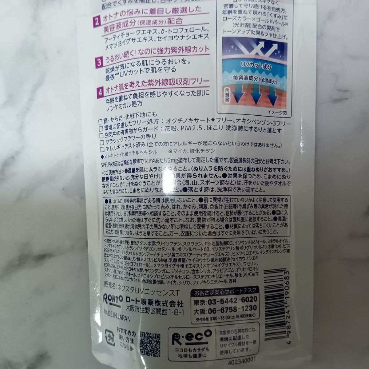 - ①持続型セラムパック処方を採用。 パックのようにムラなく密着。一日中※3うるおってオトナの肌を守り抜きます。 持続型セラムパック処方により、肌表面をなめらかに整えます。 日やけ止めを塗った肌表面をミクロレベルで観察したところ※4、セラムパック処方を採用することで、肌への密着度を高めたことを確認しています。 ②こだわりの美容液成分(保湿成分)を配合し、オトナの肌にアプローチします。 保湿成分として、アーティチョークエキス※5、δ-トコフェロール※6、メマツヨイグサエキス※7、セイヨウナシエキス※8、ヒメフウロエキス、マンダリンオレンジ果皮エキス、ヒアルロン酸Na、ビタミンC誘導体※9 を配合しています。 ③環境への影響に配慮した処方設計。 環境対応のみならず、高い紫外線カット効果があり使い心地の良い日焼け止めを高い製剤技術で実現。 日焼け止め商品の多くに配合されており、海外の一部で規制のある紫外線吸収剤をはじめとする成分を抜くことに成功。製剤技術を駆使し、高い日焼け止め効果および使い心地のよさなどお客様のユーザビリティを追究すると共に、毎日使う日焼け止め商品が環境への影響を配慮し続けられる仕組みを設計しました。 ④強力紫外線カットでシミを防ぎ※10、オトナの肌を守ります。 ・SPF50+、PA++++ で最高クラスの紫外線カットを実現 ・水や汗に強いスーパーウォータープルーフタイプ ・石けんで落とせる ・くすみを補正※11し、塗るたび、ツヤ美肌へ。 ・顔・からだ・化粧下地にも ・空気中の有害物(花粉、PM2.5、ほこり)から肌をガード※12 ・クラシックフラワーの香り <注釈> ※3 朝塗布してから夕方落とすまで ※4 ロート製薬調べ 「共焦点ラマン顕微鏡」によるイメージング技術でミクロレベルの塗布状態を観察した ※5 アーティチョーク葉エキス ※6 トコフェロール ※7 メマツヨイグサ種子エキス ※8 乳酸桿菌/セイヨウナシ果汁発 酵液 ※9 リン酸アスコルビルMg ※10 日やけによるシミ・そばかすを防ぐ ※11 メイクアップ効果による ※12 洗浄時にするりと落とす