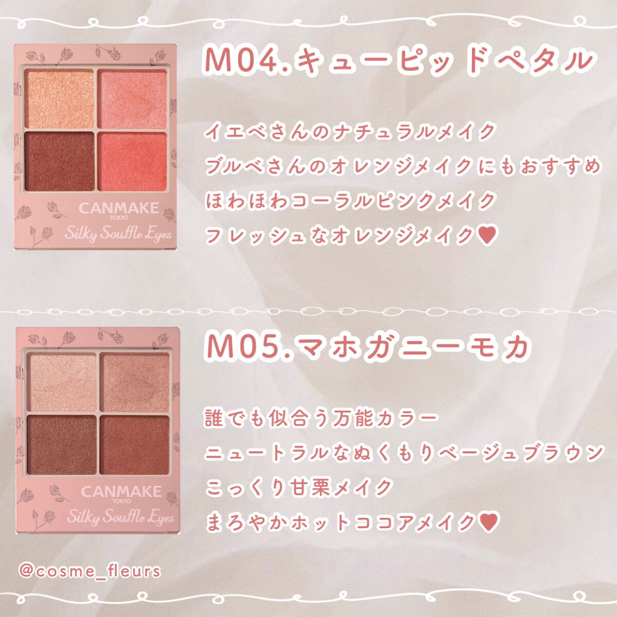 キャンメイクとは思えないふわふわマットのアイシャドウ𓂃◌𓈒𓐍マットアイシャドウのテクスチャはプチプラではトップレベルだと思います𓍯 税込み858円で、アイシャドウ・アイブロウ・ノーズシャドウの3つの使い方ができるんです…!! チップ・ブラシが本当に使いやすくてこれだけで売って欲しいと思うくらい ꪔ̤̮ ひとつは持っておきたいアイシャドウパレットお好きなカラーが見つかりますように𓂃𓈒𓂂
