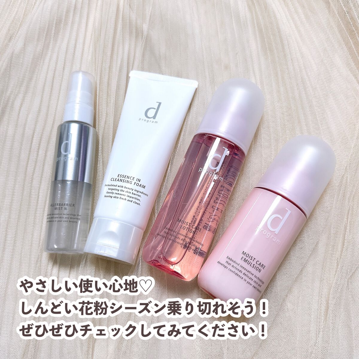 デリケートな肌を守る、dプログラムのスキンケア✨ 季節の変わり目や花粉の時期、肌のゆらぎが気になることはありませんか?😣 モイストケア ローション MB(医薬部外品)少しとろみのあるテクスチャーで、肌にスーッとなじむ感じが気持ちいい😍✨ アレルバリア ミスト Nメイクの上からシュッとするだけで、肌をバリア! 花粉や乾燥が気になる時に手放せなくなりそう🌿
