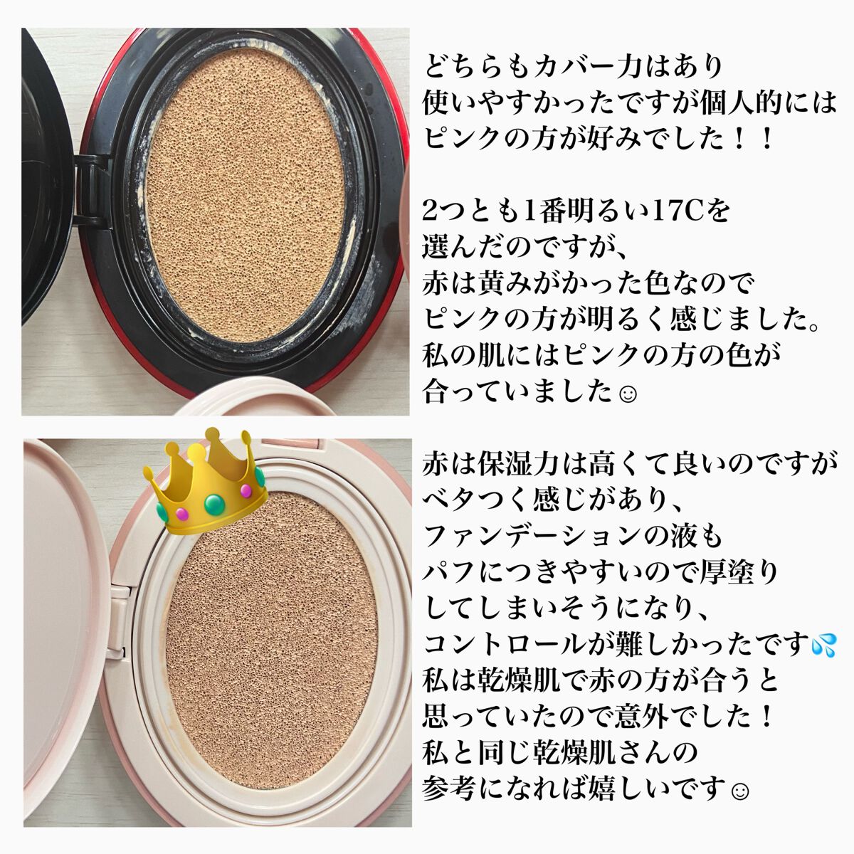 どちらもカバー力はあり使いやすかったのですが、 個人的にはピンクの方が好みでした!! 2つとも1番明るい17Cを選んだのですが、 赤は黄みがかった色なのでピンクの方が明るく感じました。 (5枚目の写真で少し分かりますかね?😖) 私の肌色にはピンクの方の色が合っていました☺︎︎︎︎ 赤は保湿力は高くて良いのですがベタつく感じがあり、 ファンデーションの液もパフにつきやすいので 厚塗りになったり厚塗りしてしまいそうになり、 コントロールが難しかったです💦 私は乾燥肌で赤の方が合うと思っていたので意外でした! 私と同じ乾燥肌さんの参考になれば嬉しいです☺︎︎︎︎