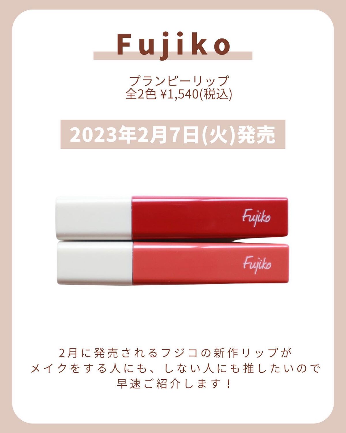 - フジコの新リップは、重ねるほどにパーンと膨んでみえるプランプティント*1。 ぷっくりと存在感のあるリップメイクで唇を主役に。 <プランプ成分(清涼成分)> "メントキシプロパンジオール”採用。 血色感、ボリューム感、クーリング感を演出します。 <オイルウォーターティント処方> 軽やかなオイルが唇に均一に伸び広がり、 FIXING。 時間が経ってもボリューム感と光沢感を演出。 しかもティントだから“落ちにくい”(*2)。 <5種の美容保湿成分配合> アルガンオイル・ツバキ種子油・アーモンド油 ティーツリー葉油・ハチミツエキス *1全てメイクアップ効果 *2効果・効能には個人差があります。