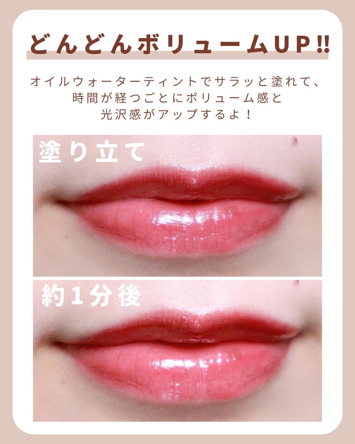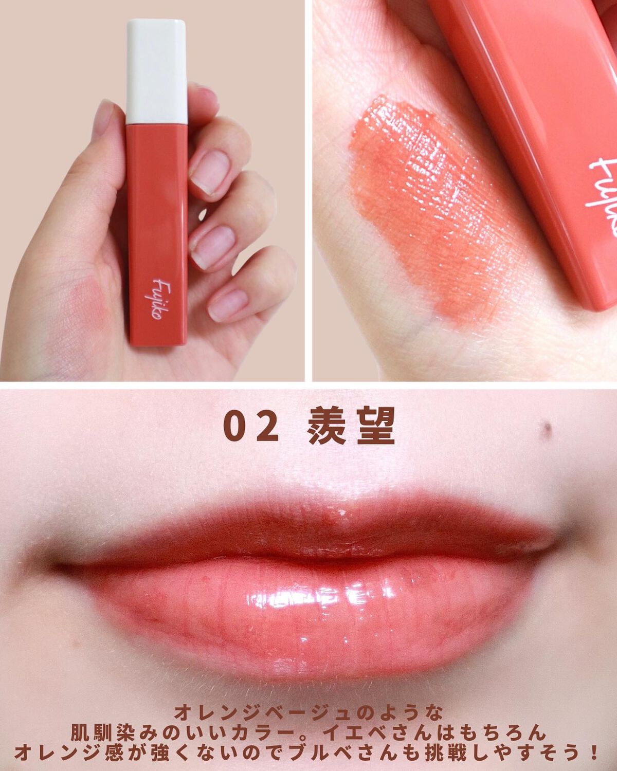 知的な色気を感じるツヤオレンジ ぷっくり存在感のある唇に仕上がるプランプティントです♡ 02番は顔色がぱっと明るく見えるおすすめカラー!! 透明感があるから重ねても重くならない 色味とぷっくり感が可愛すぎる🍊♡