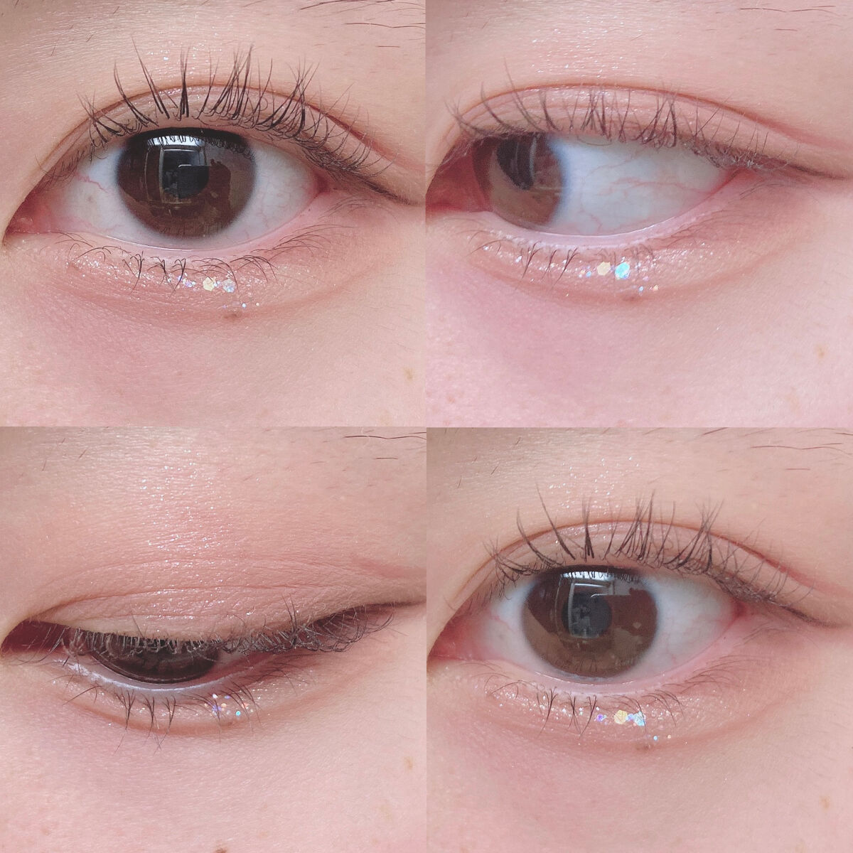 今回はキラキラで盛りつつふんわりとした印象にしたかったので以下のことを意識しました! ・ふんわりとした印象にするために締め色はメインカラーと混ぜて使う ・アイシャドウは塗りすぎ注意!少しはたいてから塗ると濃くなりにくいです ・涙袋はぷっくりに見せるために最初に締め色とメインカラーを混ぜて涙袋の影を下書きとして軽く描いておく ・ウルウルな目にしたかったので黒目の下のまつ毛の隙間にグリッターを軽く塗る ・アイラインはペンシルタイプでプラム系カラーを使い、メインカラーと締め色を混ぜアイラインをボカすとフワッとした印象になる