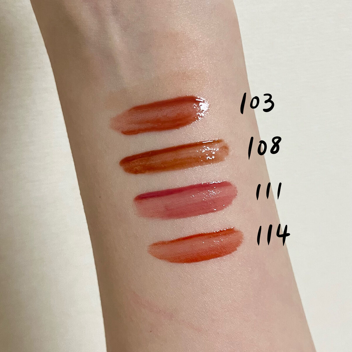 - <101 ジョイフル> 水、リンゴ酸ジイソステアリル、ダイマージリノール酸(フィトステリル/イソステアリル/セチル/ステアリル/ベヘニル)、ジイソステアリン酸ダイマージリノレイル、ノナイソステアリン酸ポリグリセリル-10、オクチルドデカノール、ビスジグリセリルポリアシルアジペート-2、水添ポリイソブテン、セチルPEG/PPG-10/1ジメチコン、ポリソルベート60(小麦由来)、イソステアリン酸ソルビタン(小麦由来)、1,2-ヘキサンジオール、グリセリン、ベヘニルアルコール、(アクリル酸/MA)コポリマーNa、ペンチレングリコール、BG、ポリアクリレート-13、トロメタミン、(アクリレーツ/アクリル酸アルキ ル(C10-30 )クロスポリマー、エチルヘキシルグリセリン、ポリイソブテン、(アクリル酸ヒドロキシエチル/アクリロイルジメチルタウリンNa)コポリマー、スクワラン、デヒドロ酢酸、ステビオシド、香料、フィチン酸、カプリリルグリコール、ジメチコン、水添ロジン酸メチル、水酸化Al、ポリソルベート20(小麦由来)、トコフェロール、ライム果汁、キイチゴ果汁、レモン果汁、マンゴー果汁、フラガリアチロエンシス果汁、アンズ果汁、オレンジ果汁、グレープフルーツ液汁、キウイ果汁、パパイア果汁、[+/-]酸化チタン、黄4、黄5、赤 104(1)、赤227、青1 <102 デューイ> 水、リンゴ酸ジイソステアリル、ダイマージリノール酸(フィトステリル/イソステアリル/セチル/ステアリル/ベヘニル)、ジイソステアリン酸ダイマージリノレイル、ノナイソステアリン酸ポリグリセリル-10、オクチルドデカノール、ビスジグリセリルポリアシルアジペート-2、水添ポリイソブテン、セチルPEG/PPG-10/1ジメチコン、ポリソルベート60(小麦由来)、イソステアリン酸ソルビタン(小麦由来)、1,2-ヘキサンジオール、グリセリン、ベヘニルアルコール、(アクリル酸/MA)コポリマーNa、ペンチレングリコール、BG、ポリアクリレート-13、トロメタミン、(アクリレーツ/アクリル酸アルキル(C10-30))クロスポリマー、エチルヘキシルグリセリン、ポリイソブテン、(アクリル酸ヒドロキシエチル/アクリロイルジメチルタウリンNa)コポリマー、スクワラン、デヒドロ酢酸、ステビオシド、香料、フィチン酸、ジメチコン、水添ロジン酸メチル、水酸化Al、カプリリルグリコール、ポリソルベート20(小麦由来)、トコフェロール、ライム果汁、キイチゴ果汁、レモン果汁、マンゴー果汁、フラガリアチロエンシス果汁、アンズ果汁、オレンジ果汁、グレープフルーツ液汁、キウイ果汁、パパイア果汁、酸化チタン、赤227、黄5、黄4、青1 <103 ハミング> 水、リンゴ酸ジイソステアリル、ダイマージリノール酸(フィトステリル/イソステアリル/セチル/ステアリル/ベヘニル)、ジイソステアリン酸ダイマージリノレイル、ノナイソステアリン酸ポリグリセリル-10、オクチルドデカノール、ビスジグリセリルポリアシルアジペート-2、水添ポリイソブテン、セチルPEG/PPG-10/1ジメチコン、ポリソルベート60(小麦由来)、イソステアリン酸ソルビタン(小麦由来)、1,2-ヘキサンジオール、グリセリン、ベヘニルアルコール、(アクリル酸/MA)コポリマーNa、ペンチレングリコール、BG、ポリアクリレート-13、トロメタミン、(アクリレーツ/アクリル酸アルキル(C10-30))クロスポリマー、エチルヘキシルグリセリン、ポリイソブテン、(アクリル酸ヒドロキシエチル/アクリロイルジメチルタウリンNa)コポリマー、スクワラン、デヒドロ酢酸、ステビオシド、香料、フィチン酸、ジメチコン、水添ロジン酸メチル、水酸化Al、カプリリルグリコール、ポリソルベート20(小麦由来)、トコフェロール、ライム果汁、キイチゴ果汁、レモン果汁、マンゴー果汁、フラガリアチロエンシス果汁、アンズ果汁、オレンジ果汁、グレープフルーツ液汁、キウイ果汁、パパイア果汁、酸化チタン、黄5、赤227、青1 <104 チェリー> 水、リンゴ酸ジイソステアリル、ダイマージリノール酸(フィトステリル/イソステアリル/セチル/ステアリル/ベヘニル)、ジイソステアリン酸ダイマージリノレイル、ノナイソステアリン酸ポリグリセリル-10、オクチルドデカノール、ビスジグリセリルポリアシルアジペート-2、水添ポリイソブテン、セチルPEG/PPG- 10/1ジメチコン、イソステアリン酸ソルビタン(小麦由来)、ポリソルベート60(小麦由来)、1,2-ヘキサンジオール、グリセリン、ベヘニルアルコール、(アクリル酸/MA)コポリマーNa、ペンチレングリコール、BG、ポリアクリレート-13、ト ロメタミン、(アクリレーツ/アクリル酸ア ルキル(C10-30))クロスポリマー、エチルヘキシルグリセリン、ポリイソブテ ン、(アクリル酸ヒドロキシエチル/アクリ ロイルジメチルタウリンNa)コポリマー、スクワラン、デヒドロ酢酸、ステビオシド、香料、カプリリルグリコール、ポリソルベー ト20(小麦由来)、トコフェロール、ライム果汁、キイチゴ果汁、レモン果汁、マンゴー 果汁、フラガリアチロエンシス果汁、アンズ 果汁、オレンジ果汁、グレープフルーツ液 汁、キウ