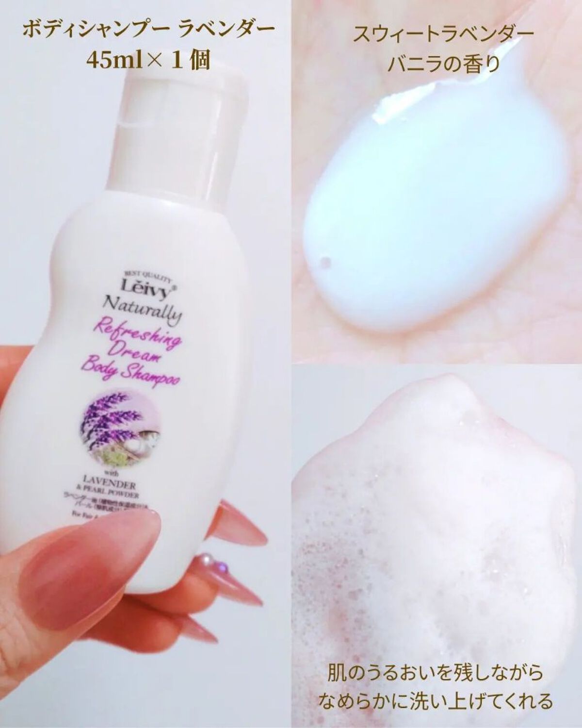 Leivyボディシャンプーゴートミルク前から気になっていたのでミニサイズを購入してみました✨ねっとりしたテクスチャーでふわふわの軽い泡立ちで洗い流した後もしっとりしています🥛やさしい洗い上がりでしっとり感が続くので使い始めてからは肌が乾燥しに...