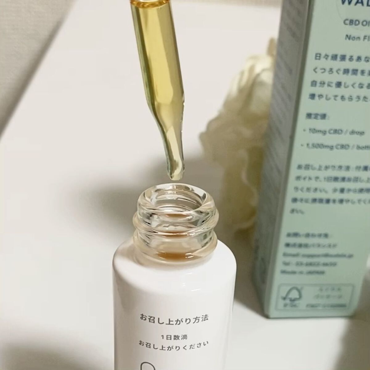 WALALAのCBDオイル💭 「夜中に目が覚めてしまう」「朝起きてもスッキリしない」といった方におすすめみたいです 寝る前に摂取するのがいいらしく、、 直接舌下に摂取したり、ドリンクに入れたりヨーグルトなどの食べ物に入れたりするのもおすすめです◎ 無香料ですが、ちょっぴりオリーブオイルの味がします💭 私は睡眠時間が短くなってしまうことが多いので、ちょっとでも睡眠の質がよくなればと思って飲んでます…! ぜひ試してみてください!