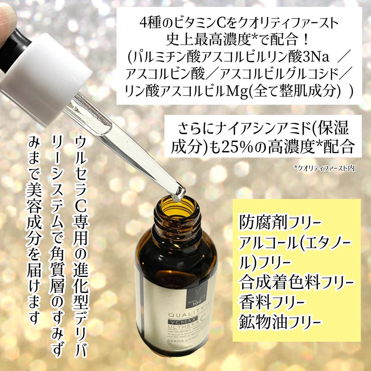 皮脂による毛穴開きやシミにお悩みの方に✨ ベタつきなくサラサラとした付け心地😌💕 💛シリーズ最高峰*1 の4種類のビタミンCを配合 ・パルミチン酸アスコルビルリン酸3Na ・リン酸アスコルビルMg ・アスコルビルグルコシド ・アスコルビン酸 🤍ナイアシンアミド25%高濃度配合 5つのフリー / ・防腐剤 ・アルコール(エタノール) ・合成着色料 ・香料 ・グリセリン