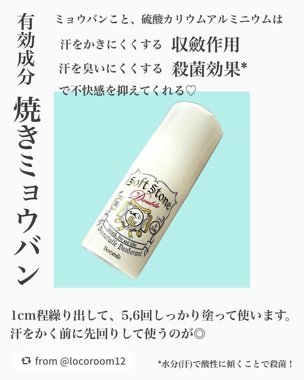 - <20g > 有効成分:焼ミョウバン、イソプロピルメチルフェノール その他成分:シクロペンタシロキサン、ステアリルアルコール、POPブチルエーテルー1、セスキイソステアリン酸ソルビタン、水添ヒマシ油、メントール、低温焼成酸化Zn、天然ビタミンE、トリ(カプリル・カプリン酸)グリセリル、茶エキスー1