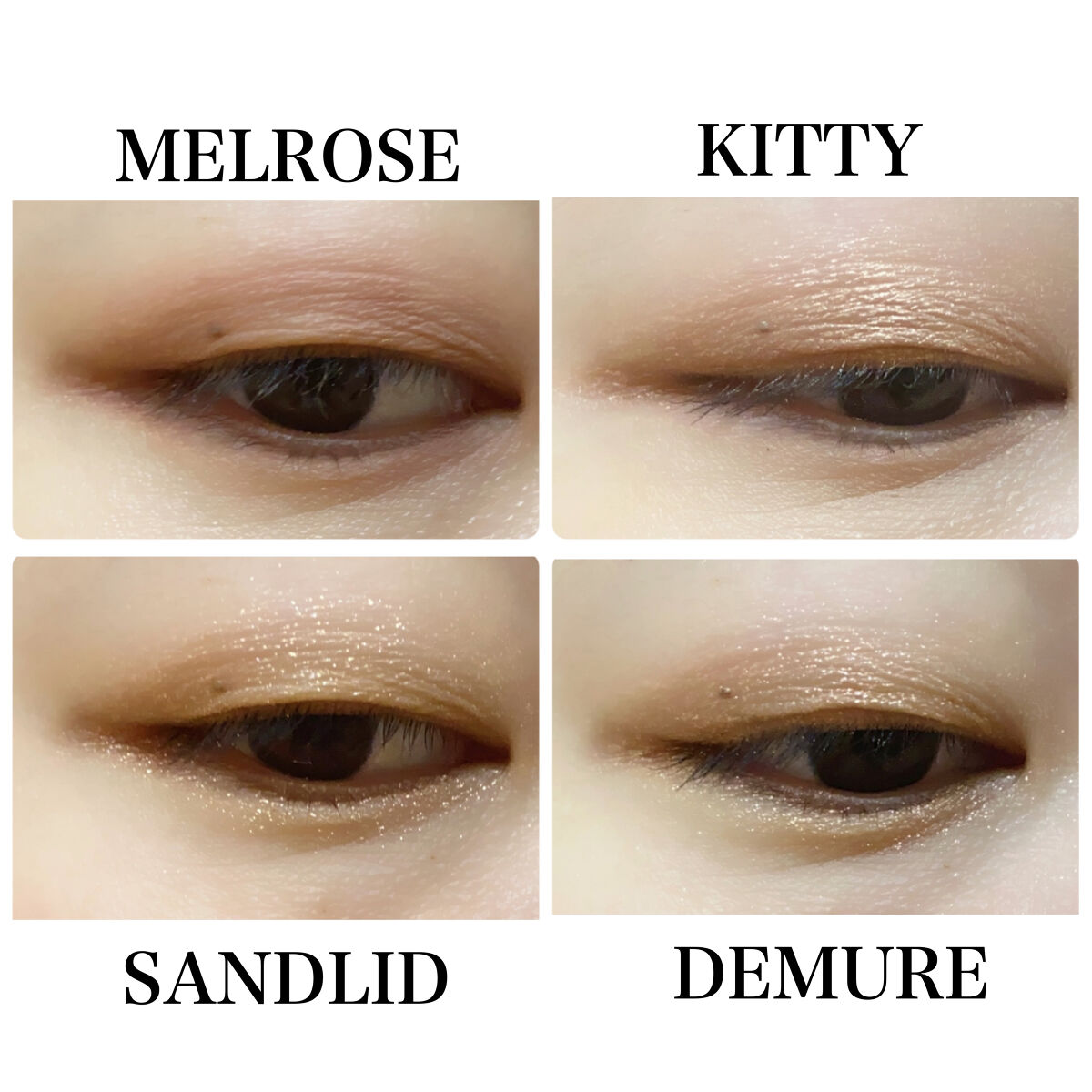 このパレットはベージュニットがモチーフで、ベージュトーンのシャドウがたくさん。 粉質も柔らかくてしっとりしていて、瞼に密着してくれる感じです。 かわいいのに使いやすいなんて優秀すぎるパレット! 私のお気に入りカラーはFのメロウアルパカ!コーラルベージュに繊細なラメでめちゃくちゃ美しい♡