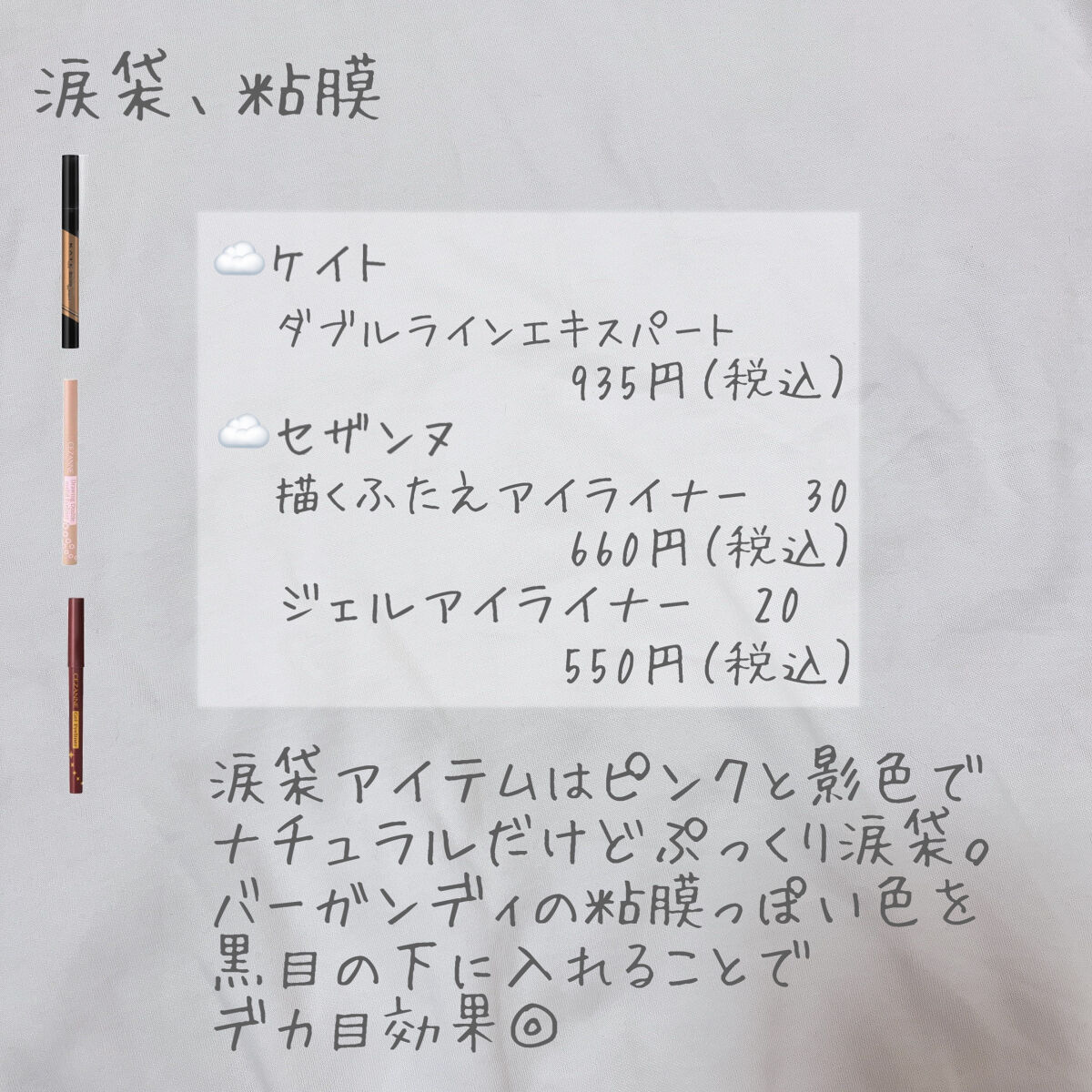 プチプラでできます🕊 濃いめですがその分写真を撮っても涙袋が皆無になりません 女王のカメオパレットのシャルロットもかわいいカラーなので今度はそれを使ったオレンジメイクをしてみたくなりました! 用意するもの ①ダイソー IDATEまたはUR GLAM スリムスケッチアイブロウペンシル ライトブラウン ②セザンヌ描くふたえライナー 10影用ブラウン