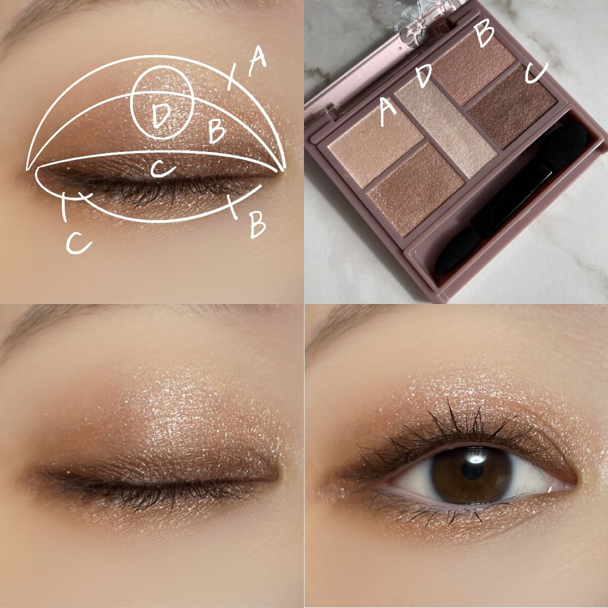 - 1枚のパレットで2つのスタイルが完成! 5色の欲ばりアイシャドウ♥ メインカラーを選んで2つのスタイルが楽しめる! A→B→D でスタイル1 A→C→D でスタイル2 繊細な粉質が、しっとりとまぶたに密着して色落ちを防ぎます。 透明感のあるキラうるトッピングジュエル(繊細ラメ)は、気分によってトッピング!