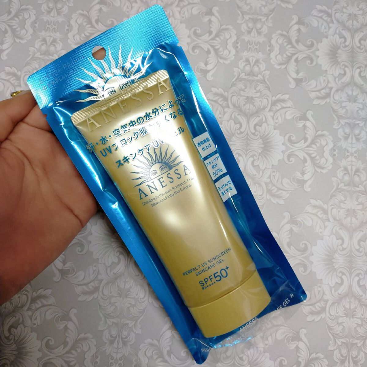 - SPF50+ ・ PA++++ 顔・ から だ用 汗、水、そして空気中の水分※10 に反応してUVブロック膜が強くなる技術搭載 毎日つけたくなる みずみずしいスキンケア UVジェル ※10 暑い時期の高湿度環境 〇汗、水、そして空気中の水分に自動的に反応して 、 UVブロック膜が 強くなります 。-オートブースタ ー 技術 〇透明美肌仕上げ-ビューティ ー アップ 〇スキンケア成分50%配合 〇保湿成分:コラーゲン、スーパーヒアルロン酸※9、グリセリン ※9 アセチルヒアルロン酸Na 〇長時間保湿持続効果 〇スーパーウォータープルーフ 〇マスク蒸れ対応 〇耐こすれ 〇化粧下地効果 〇せっけんで落とせる 〇みずみずしいジェル 〇生まれ変わった、心地よいフルーティーフローラルの香り 〇大気中に浮遊する微粒子、PM2.5などから肌を保護します。 -微粒子付着防止対応 〇海に流れ出にくいオーシャンフレンドリー処方※6 ※6 自社品内の耐水処方でない商品と比較 〇植物由来の原料を一部使用した袋 〇無着色・ノンコメドジェニックテスト・アレルギーテスト済み (全ての方にニキビができない、アレルギーが起きないというわけではありません)