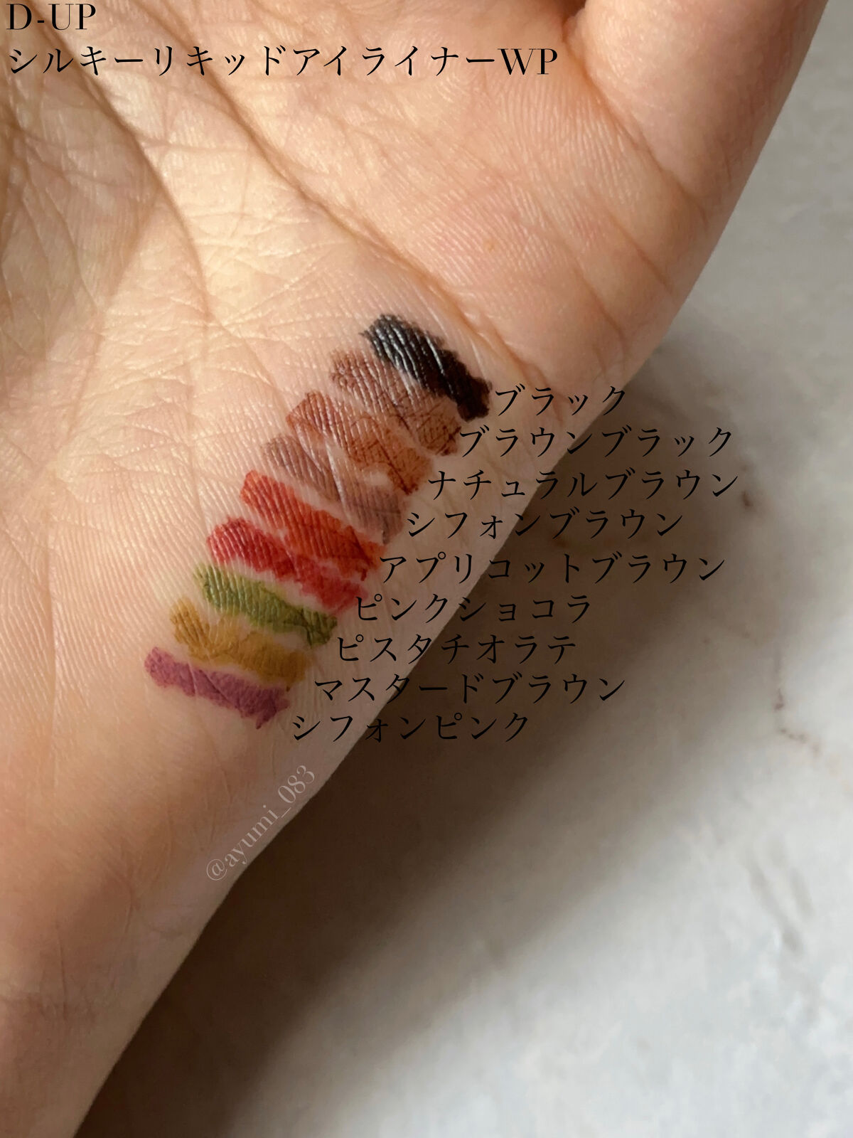 - 筆先までずっとなめらか、目尻で感動するリキッドアイライナー。 必要な量が肌にのる新設計で、まぶたの上をすべるような、滑らかな描き心地。しなやかでコシのある筆が、筆圧のコントロールを容易にし、太いラインも細いラインも思い通りに仕上げます。水、汗、涙に強いウォータープルーフタイプなのに、通常洗顔で簡単オフ。肌に色素が残らない顔料を使用。5種類の美容液成分を従来品の200%配合し、メイクしながら目元ケアまで。 ●ブラウンブラック ※2020年9月12日 バラエティショップ先行発売 ●漆黒ブラック ※2020年12月頃発売予定 ●ナチュラルブラウン ※2020年12月頃発売予定 ●シフォンブラウン 「毎日メイクに透明感と抜け感」 ブラウンでも、グレーでも、ベージュでもないニュアンスカラー。 自然な印影で素の目元を際立て、頑張りすぎない、ふんわりとした目元に。 ●アプリコットブラウン 「じゅわっと血色感。 肌に馴染むおしゃれカラー」 温かみのあるアプリコットがじゅわっと滲む血色感を目元に演出。 肌馴染みが良いので、カラーライナーに抵抗がある方もブラウンの延長線上で楽しめる、使いやすい色味です。 ”ちょっとオシャレ”な空気感を演出するカラー。 ●ピンクショコラ アイライナー 「ピンクが溶け込む濃厚ブラウン」 肌馴染みが良く、目元にじんわり血色感をプラス。 さりげなく女性らしさが加速するようなカラー。 ●ピスタチオラテ (2022年7月29日(金)発売) 「“目尻”に抜け感アクセント」 肌に馴染むのに映える絶妙なグリーン。 トレンドカラーに“くすみ”と“抜け感”をプラスしたまろやかな発色。 ●マスタードブラウン 「“イエロー”が揺れる、大人の洒落色」 (2022年7月29日(金)発売) まるで太陽のような暖かさを感じる新しいブラウン。 ほんのり感じるイエローでメイクが一気に垢抜ける稀有な色。 ●シフォンピンク(2023年2月10日発売) 「ふんわり柔らか"まろみピンク"」 甘くなりすぎない青みニュアンスで目元の透明感UP。 目元を引き締め、ピンクメイクにありがちな腫れぼったさを解消。 ●ミルクカプチーノ(2023年4月21日発売) まろやかな深みの“優しい締め色” どんなメイクにも合わせやすいカラー。 自然な陰影でさりげなく目幅を拡張します。 ●グレーカシミア(2023年10月1日発売) ブラウンがほんのり溶け込んだ、暖色グレー まろやかな発色で、パーソナルカラーを問わず肌に馴染む 目元の陰影になりすまし、抜け感と目力を欲張りに叶える ●ダークフィグ(2024年6月1日発売) するする”なめらか。描きやすいのに、落ちにくい。 クッキリ可愛いほの甘ダークブラウン ●ピーチモカ(2024年8月1日発売) ふわっと自然に盛れる“桃色ブラウン” ほんのり血色感で目元にうるみ感を演出 ●スターダストブラウン(2024年12月11日発売) キラッと繊細に輝く''星屑ブラウン'' 透け感のあるダークブラウンの色味とラメの輝きが、目元に艶のある立体感を演出 ●チャコールモカ(2025年4月10日発売) 目元を締める''深みグレージュ'' 黄みや赤みに偏りすぎない絶妙な色設計で、自然に目元を強調