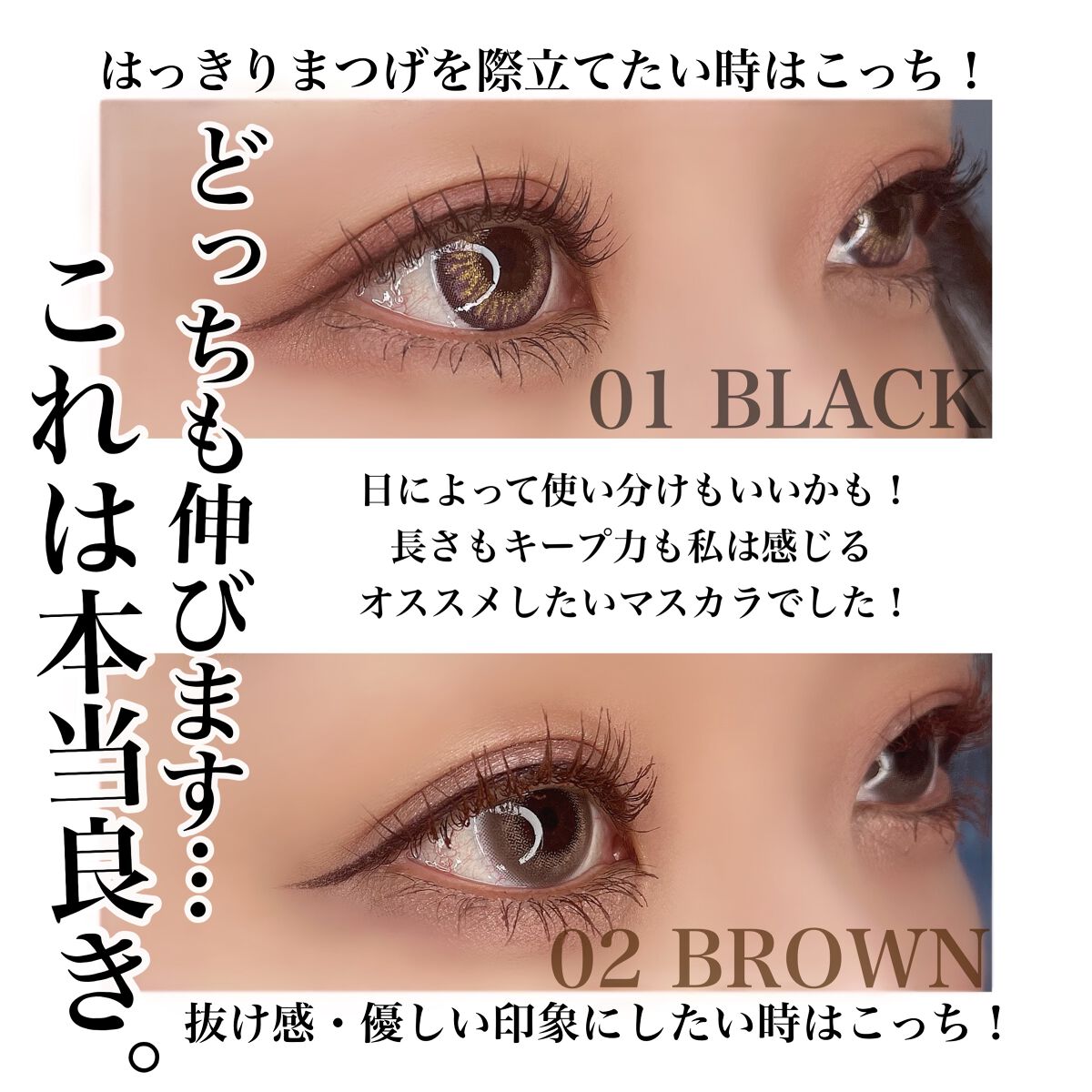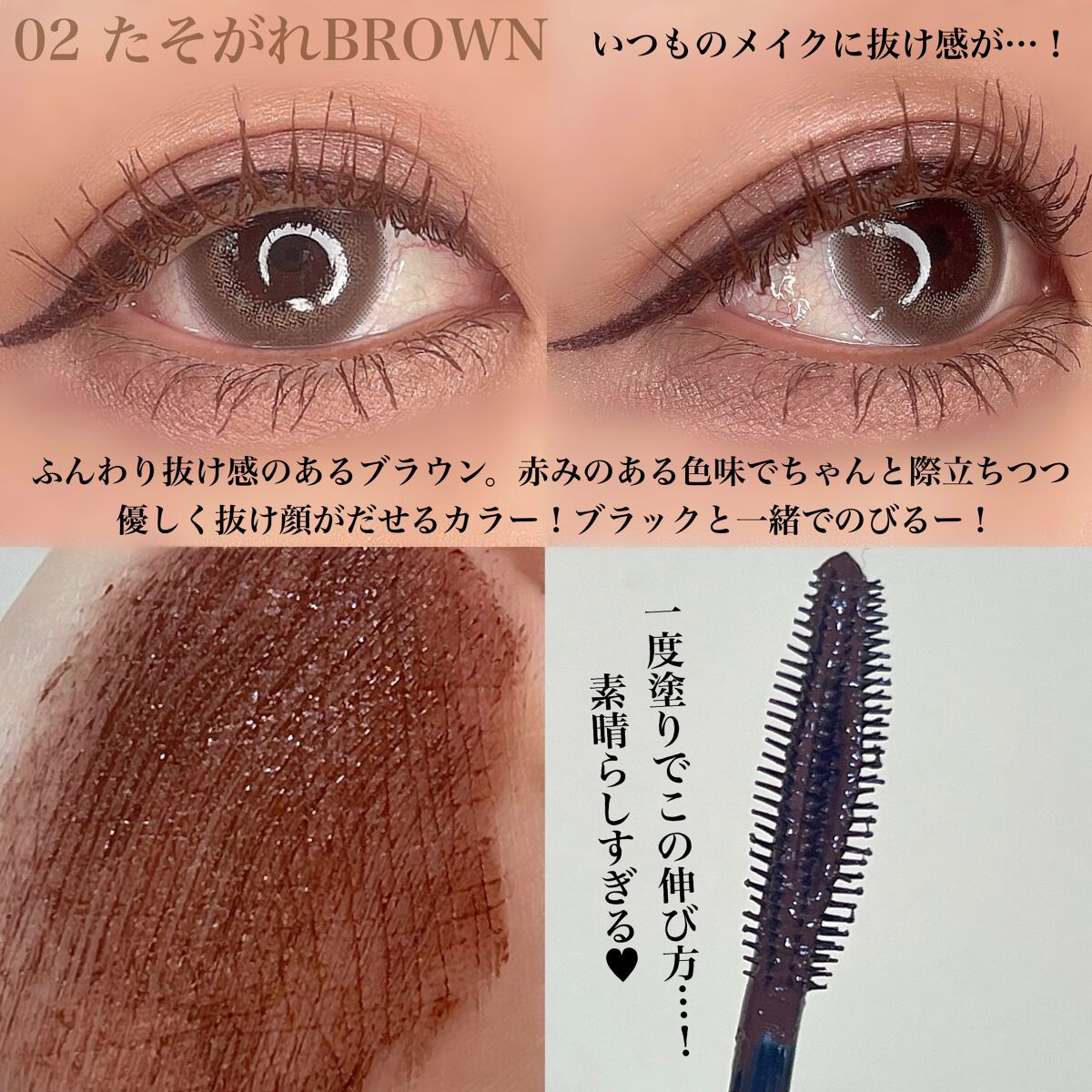 前回も投稿したんだけど(10/11の投稿です✍️)ぎゅんぎゅん伸びるのは知っていて、今回の新色も楽しみにしてた… その時にダークブラウンとかあったらいいなって言ってたんだけど…発売されちゃった👏アリガトウゴザイマス たそがれブラウンって名前にぴったりな少し赤みのあるブラウン✨ ブラック同様、繊維なしなのに一度塗りでしっかりのびる〜👀⤴︎ マスカラのブラシが不思議な形で(毎回食肉植物に見える。笑)アーチ状に並んだ5列のコームが目頭、目尻のまつ毛までしっかりキャッチしてくれるよ✨ 塗り重ねるごとに長さは出るんだけど重ねると多少ダマ?塊?みたいのが私は気になって(ならないって人もいるから塗り方が悪いのかな😂)ピンセットで整えてるよ✨! 02 たそがれブラウン 赤みブラウンで抜け感も出せて優しい目元になる✨ しかも絶妙なブラウンだから際立ち感もある。気分や、メイクによって使い分けするのもいいかも🥺✨