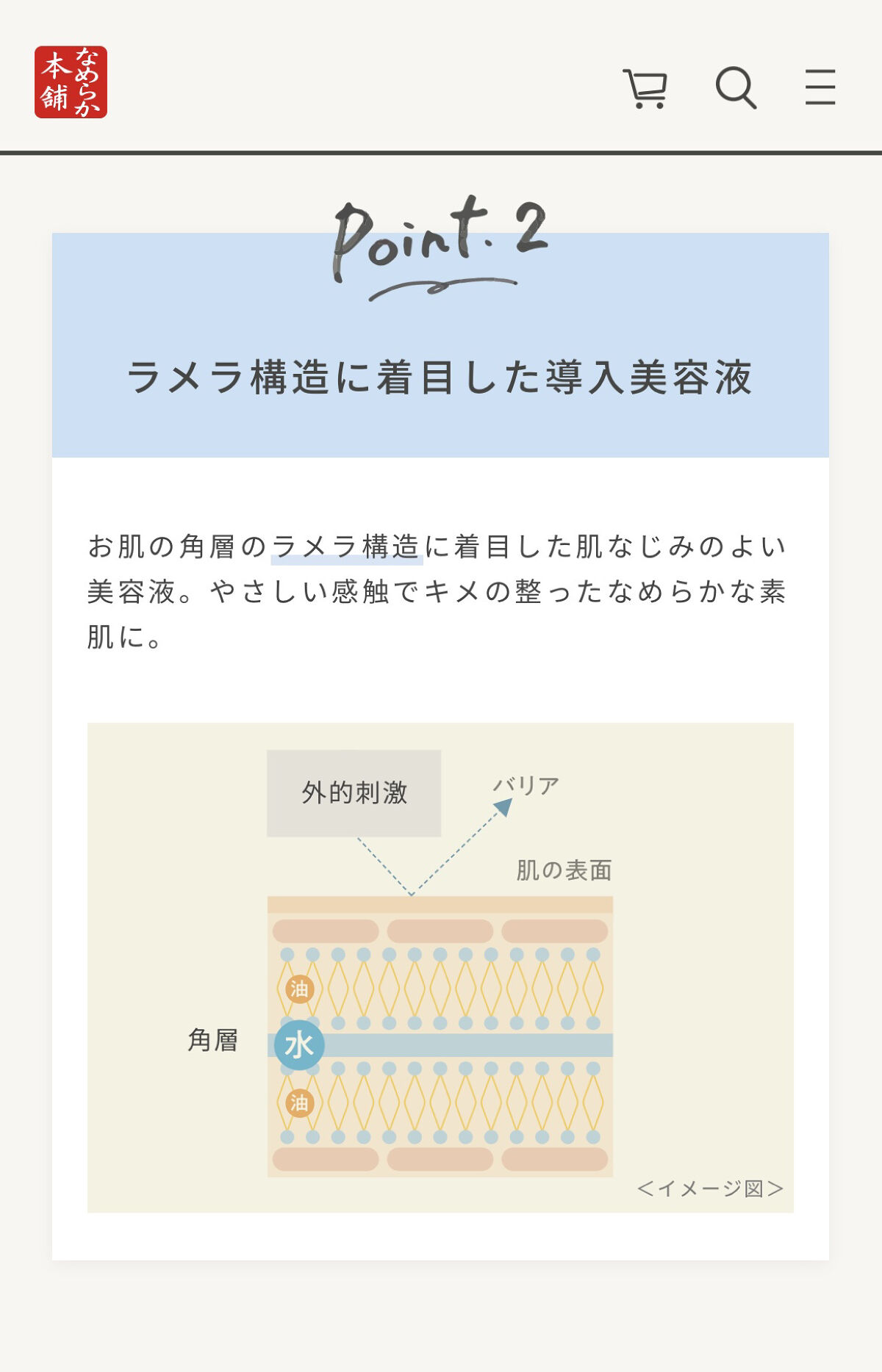 - 「なめらか本舗」から、世界新開発※1の成分「高純度豆乳イソフラボン※2」を配合した、肌を整える導入美容液が新登場!肌メンテで"目指せ、ゆらがない肌!" さらっとしながらも、絶妙なとろみのあるテクスチャーが気持ちよく肌に浸透※3します。 洗顔の後、化粧水の前に使用していただく導入美容液です。手に適量(1~2プッシュ)をとり、お顔全体になじませてください。重ねづけして化粧水としてもお使いいただけます。 【おすすめポイント】 1.豆乳発酵液※2に加え、高純度豆乳イソフラボン※2と、ヒト型セラミド※2も配合!ミネラル※2やビタミン※2などのサポート成分も贅沢配合🎵 2.ラメラ構造に着目して処方開発!キメの整ったなめらかな素肌に導きます。 3.お肌のことを考えた処方設計(無香料・無着色・無鉱物油) ※1 化粧品原料として世界で初めてINCI名(国際化粧品表示名称)を取得しました ※2 保湿成分 ※3 角層まで