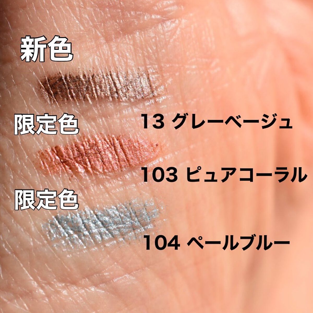 - <01 ブラウンレッド> トリメチルシロキシケイ酸、メチルトリメチコン、マイクロクリスタリンワックス、ミツロウ、シクロペンタシロキサン、(アクリレーツ/アクリル酸ステアリル/メタクリル酸ジメチコン)コポリマー、キャンデリラロウ、トリ(ベヘン酸/イソステアリン酸/エイコサン二酸)グリセリル、ミネラルオイル、合成ワックス、リンゴ酸ジイソステアリル、水添ポリイソブテン、炭酸プロピレン、カルナウバロウ、シメチコン、ジステアルジモニウムヘクトライト、ジメチコン、酸化スズ、酸化チタン、マイカ、酸化鉄、赤202 <02 ピンクグロウ> メチルトリメチコン、トリメチルシロキシケイ酸、マイクロクリスタリンワックス、ミツロウ、シクロペンタシロキサン、(アクリレーツ/アクリル酸ステアリル/メタクリル酸ジメチコン)コポリマー、キャンデリラロウ、トリ(ベヘン酸/イソステアリン酸/エイコサン二酸)グリセリル、合成フルオロフロゴパイト、ミネラルオイル、リンゴ酸ジイソステアリル、合成ワックス、水添ポリイソブテン、シリカ、水酸化Al、炭酸プロピレン、カルナウバロウ、シメチコン、ジステアルジモニウムヘクトライト、ジメチコン、酸化スズ、酸化チタン、マイカ、酸化鉄、赤202 <03 マンダリン> トリメチルシロキシケイ酸、メチルトリメチコン、合成フルオロフロゴパイト、シクロペンタシロキサン、マイクロクリスタリンワックス、ミツロウ、(アクリレーツ/アクリル酸ステアリル/メタクリル酸ジメチコン)コポリマー、キャンデリラロウ、トリ(ベヘン酸/イソステアリン酸/エイコサン二酸)グリセリル、ミネラルオイル、合成ワックス、水添ポリイソブテン、リンゴ酸ジイソステアリル、炭酸プロピレン、カルナウバロウ、シメチコン、ジステアルジモニウムヘクトライト、ジメチコン、酸化スズ、マイカ、酸化鉄 <06 フォグブラウン(復刻限定色)> トリメチルシロキシケイ酸、メチルトリメチコン、シクロペンタシロキサン、マイクロクリスタリンワックス、ミツロウ、(アクリレーツ/アクリル酸ステアリル/メタクリル酸ジメチコン)コポリマー、キャンデリラロウ、トリ(ベヘン酸/イソステアリン酸/エイコサン二酸)グリセリル、ミネラルオイル、合成ワックス、水添ポリイソブテン、リンゴ酸ジイソステアリル、合成フルオロフロゴパイト、炭酸プロピレン、カルナウバロウ、シメチコン、ジステアルジモニウムヘクトライト、ジメチコン、酸化スズ、酸化チタン、マイカ、酸化鉄 <08 トープグレージュ(限定色)> マイカ、トリメチルシロキシケイ酸、メチルトリメチコン、シクロペンタシロキサン、マイクロクリスタリンワックス、ミツロウ、(アクリレーツ/アクリル酸ステアリル/メタクリル酸ジメチコン)コポリマー、キャンデリラロウ、トリ(ベヘン酸/イソステアリン酸/エイコサン二酸)グリセリル、ミネラルオイル、リンゴ酸ジイソステアリル、合成ワックス、水添ポリイソブテン、合成フルオロフロゴパイト、ジステアルジモニウムヘクトライト、炭酸プロピレン、カルナウバロウ、シメチコン、ジメチコン、酸化スズ、酸化チタン、酸化鉄 <09 ヘーゼルグリーン(限定色)> マイカ、トリメチルシロキシケイ酸、メチルトリメチコン、シクロペンタシロキサン、マイクロクリスタリンワックス、ミツロウ、キャンデリラロウ、(アクリレーツ/アクリル酸ステアリル/メタクリル酸ジメチコン)コポリマー、トリ(ベヘン酸/イソステアリン酸/エイコサン二酸)グリセリル、ミネラルオイル、合成ワックス、水添ポリイソブテン、リンゴ酸ジイソステアリル、ジステアルジモニウムヘクトライト、炭酸プロピレン、カルナウバロウ、シメチコン、ジメチコン、酸化スズ、酸化チタン、酸化鉄、コンジョウ <10 グレイッシュモーヴ> マイカ、トリメチルシロキシケイ酸、メチルトリメチコン、シクロペンタシロキサン、マイクロクリスタリンワックス、ミツロウ、(アクリレーツ/アクリル酸ステアリル/メタクリル酸ジメチコン)コポリマー、トリ(ベヘン酸/イソステアリン酸/エイコサン二酸)グリセリル、キャンデリラロウ、ミネラルオイル、水添ポリイソブテン、合成ワックス、ジステアルジモニウムヘクトライト、リンゴ酸ジイソステアリル、合成フルオロフロゴパイト、炭酸プロピレン、カルナウバロウ、コメヌカロウ、シメチコン、ジメチコン、ステアリン酸、パラフィン、トコフェロール、酸化スズ、酸化チタン、酸化鉄、コンジョウ <101 スターリーブルー(限定色)> メチルトリメチコン、トリメチルシロキシケイ酸、シクロペンタシロキサン、マイクロクリスタリンワックス、ミツロウ、リンゴ酸ジイソステアリル、合成ワックス、(アクリレーツ/アクリル酸ステアリル/メタクリル酸ジメチコン)コポリマー、トリ(ベヘン酸/イソステアリン酸/エイコサン二酸)グリセリル、キャンデリラロウ、ミネラルオイル、水添ポリイソブテン、合成フルオロフロゴパイト、ジステアルジモニウムヘクトライト、炭酸プロ