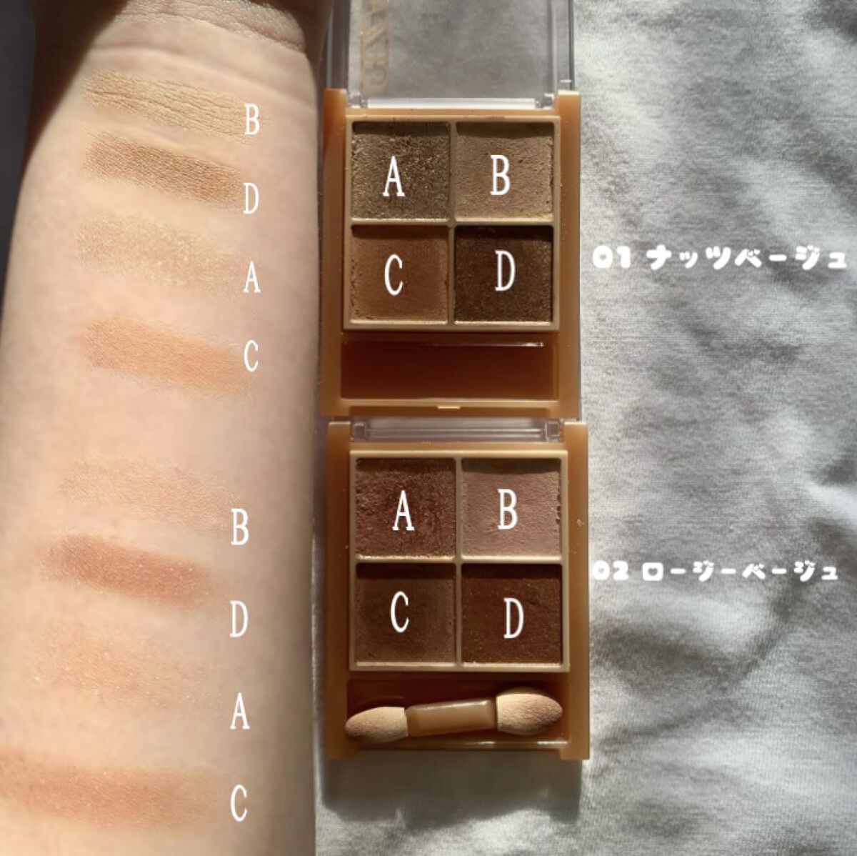 - ラメ・パール・マット3質感の4色アイシャドウ。 肌馴染みの良いベージュを基調としたカラー。ラメ・パール・マットの3質感を重ねて、自然にまぶたを強調し奥行のある大きな目元へ。 しっとり溶け込むような柔らかなパウダーなので、スルスル伸びてまぶたにピタッと密着。保湿成分(スクワラン・ホホバ種子油)配合。