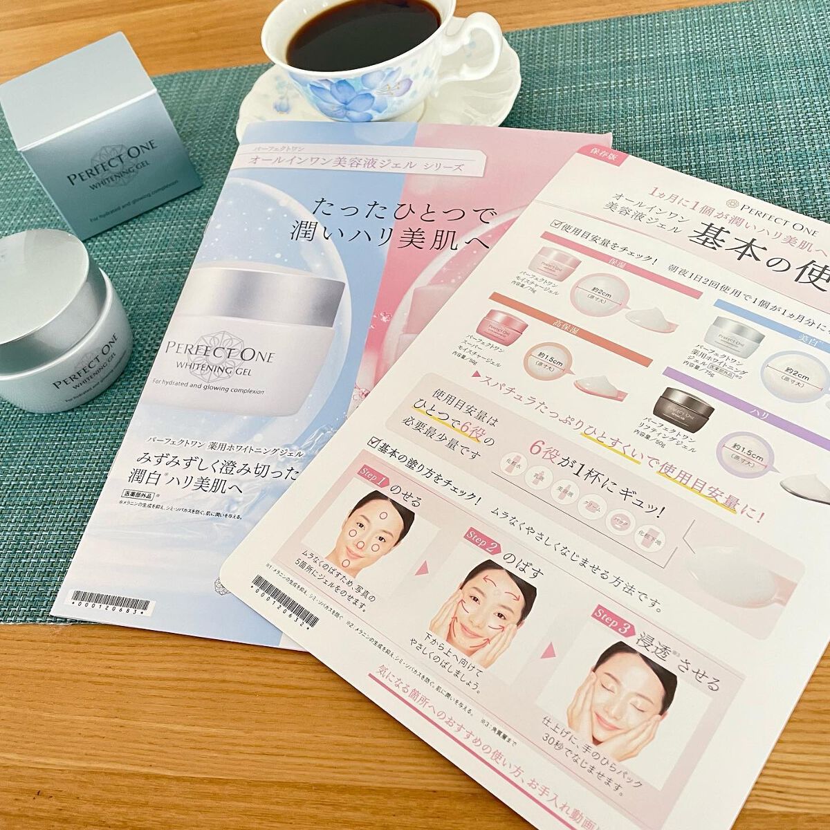 - <パーフェクトワン 薬用ホワイトニングジェル> アルブチン、L ーアスコルビン酸 2 ーグルコシド、グリチルリチン酸ジカリウム、水溶性コラーゲン液、水溶性コラーゲン液(3)、加水分解 コラーゲン液(4)、サクシニルアテロコラーゲン液、コラーゲン・トリペプチド F、イソステアロイル加水分解コラーゲン液(2)、シクロヘキサン ジカルボン酸ビスエトキシジグリコール、イザヨイバラエキス、ビルベリー葉エキス、アルピニアカツマダイ種子エキス、チンピエキス、タイムエキ ス(1)、セイヨウオオバコ種子エキス、ウメ果実エキス、豆乳発酵液、シャクヤクエキス、異性化糖、ヒアルロン酸ナトリウム(2)、加水分解ヒアル ロン酸、ステアロイルオキシヘプタコサノイルフィトスフィンゴシン、N ーステアロイルジヒドロスフィンゴシン、N ーステアロイルフィトスフィンゴ シン、ヒドロキシステアリルフィトスフィンゴシン、フィトステロール、油溶性シコンエキス(1)、ゲットウ葉エキス、ヒメフウロエキス、ヨクイニンエ キス、シーグラスエキス、サンゴ草抽出液、アーティチョークエキス、ニーム葉エキス、オウゴンエキス、センブリエキス、酵母エキス (4)、ニンジン エキス、アロエエキス(2)、サクラ葉抽出液、ユキノシタエキス、プラセンタエキス (1)、セイヨウナシ果汁発酵液、パウダルコ樹皮エキス、カンゾ ウ抽出末、カンゾウフラボノイド、植物性スクワラン、コンドロイチン硫酸ナトリウム、εーポリリジン 10% 溶液、ポリグルタミン酸塩、濃グリセリ ン、1,3 ーブチレングリコール、1,2 ーペンタンジオール、グリセリン、リン酸 L ーアスコルビルマグネシウム、トレハロース、L ーオキシプロリン、ホエイ(2)、トリ2 ーエチルヘキサン酸グリセリル、アルギン酸ナトリウム、サラシミツロウ、無水ケイ酸、ベヘニルアルコール、シリル化処理無水 ケイ酸、水素添加大豆リン脂質、モノミリスチン酸デカグリセリル、親油型モノステアリン酸グリセリル、カルボキシビニルポリマー、水酸化ナトリ ウム、2 ーエチルヘキサン酸セチル、メチルポリシロキサン、天然ビタミン E、パルミチン酸セチル、低強度カンテン末、キサンタンガム、N ーアセ チルー L ーシステイン、クエン酸、ピロ亜硫酸ナトリウム、スクワラン、ジエチレントリアミン五酢酸五ナトリウム液、無水エタノール、エタノール、フェノキシエタノール、香料