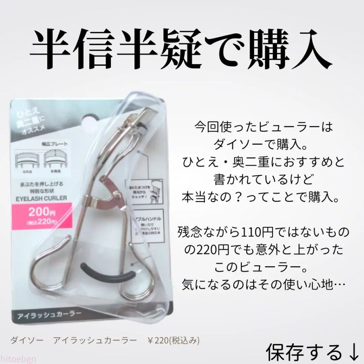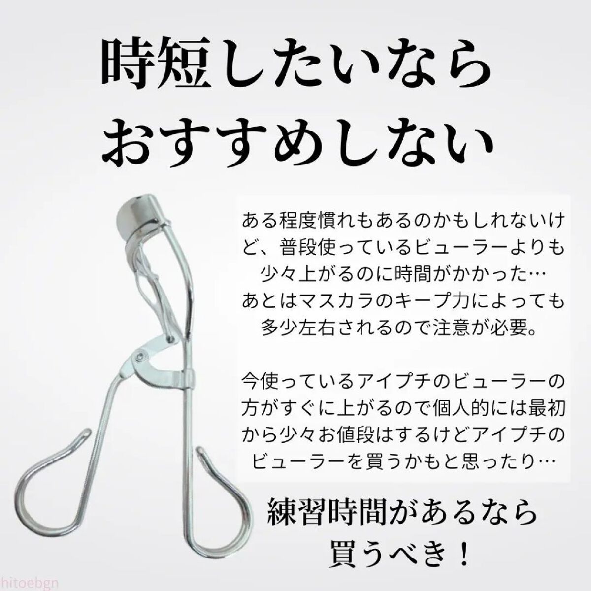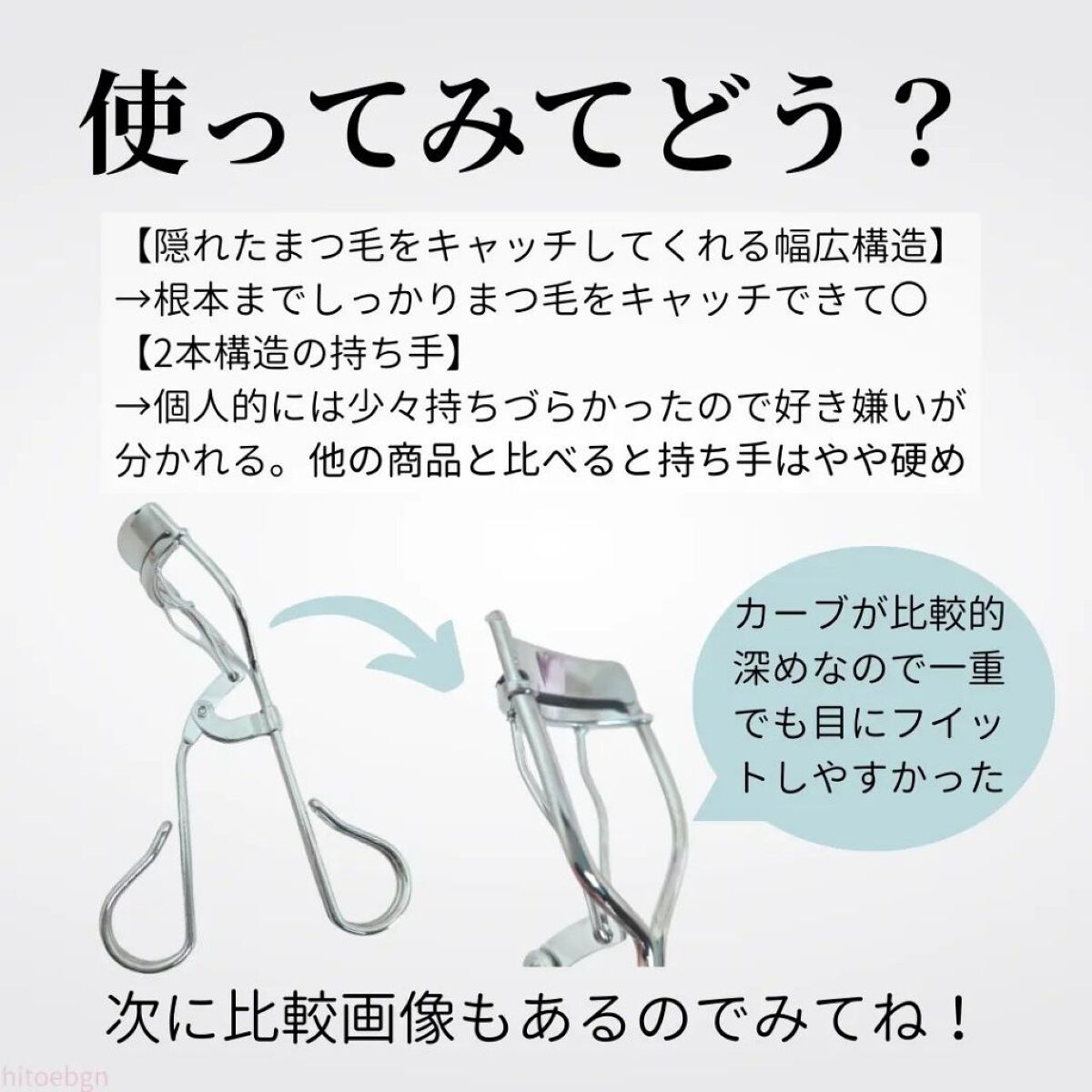 アイプチひとえ奥ぶたえ用カーラーです。カーブが浅いんですよ。画像で伝わりますでしょうか?平たい顔族なので。一般的なビューラーではどうもうまく挟めない。そこでこのビューラーです。カーブの浅さが平たい顔族にジャストフィット。ビューラーなんて100...