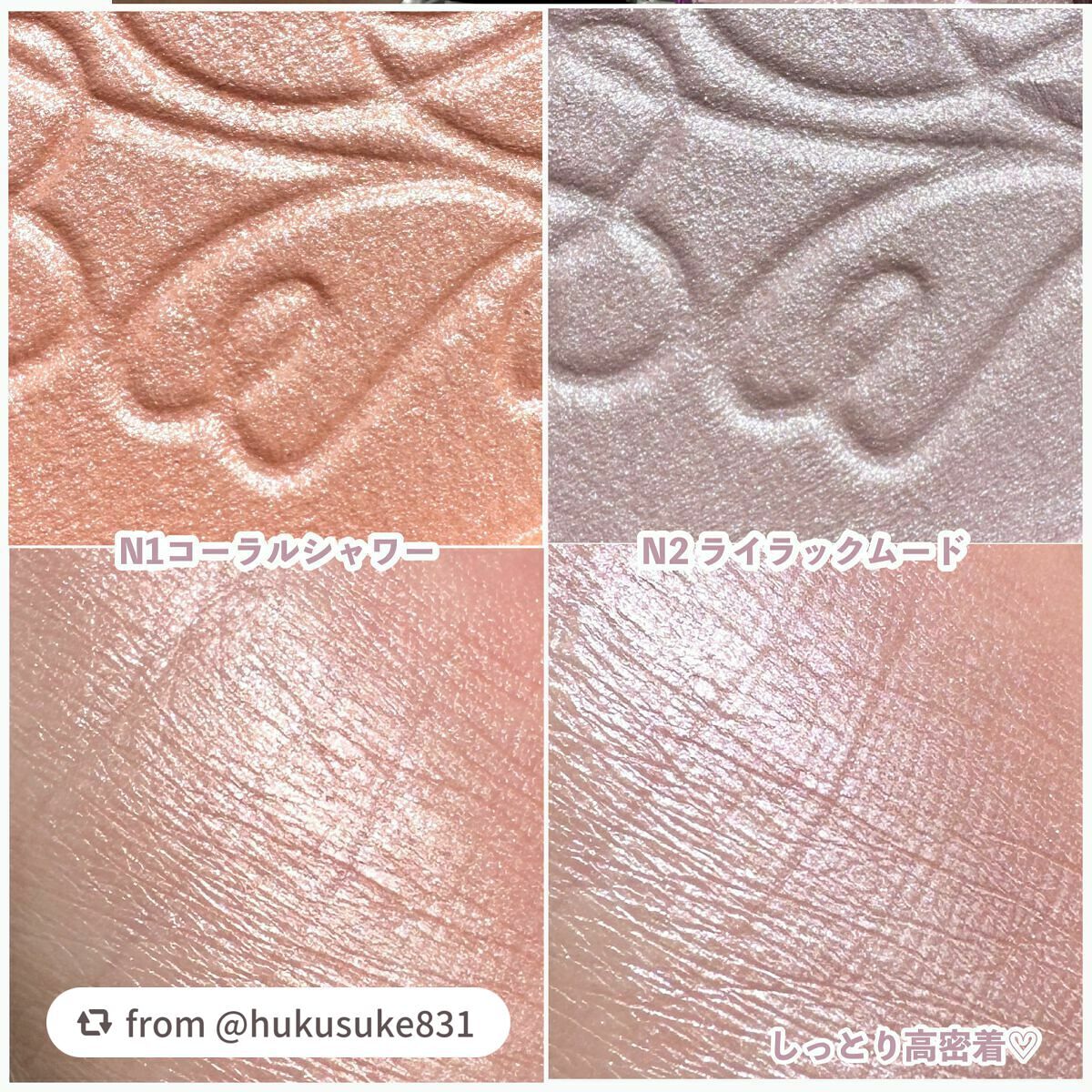 - <N1 コーラルシャワー> トリイソステアリン酸ポリグリセリル-2、トリエチルヘキサノイン、(フッ化/水酸化/酸化)/(Mg/K/ケイ素)、ヘキサ(ヒドロキシステアリン酸/ステアリン酸/ロジン酸)ジペンタエリスリチル、ミリスチン酸亜鉛、(HDI/トリメチロールヘキシルラクトン)クロスポリマー、ペンチレングリコール、ビスジグリセリルポリアシルアジペート-2、フェノキシエタノール、ハイドロゲンジメチコン、メチルパラベン、シリカ、トコフェロール、BG、水、ヒアルロン酸Na、カミツレ花エキス、ラベンダー花エキス、ローズマリー葉エキス、タルク、マイカ、酸化チタン、合成フルオロフロゴパイト、酸化鉄、酸化スズ、赤226、黄4、水酸化Al <N2 ライラックムード> トリイソステアリン酸ポリグリセリル-2、トリエチルヘキサノイン、(フッ化/水酸化/酸化)/(Mg/K/ケイ素)、ヘキサ(ヒドロキシステアリン酸/ステアリン酸/ロジン酸)ジペンタエリスリチル、ミリスチン酸亜鉛、(HDI/トリメチロールヘキシルラクトン)クロスポリマー、ペンチレングリコール、ビスジグリセリルポリアシルアジペート-2、フェノキシエタノール、ハイドロゲンジメチコン、メチルパラベン、シリカ、トコフェロール、BG、水、ヒアルロン酸Na、カミツレ花エキス、ラベンダー花エキス、ローズマリー葉エキス、タルク、合成フルオロフロゴパイト、酸化チタン、マイカ、グンジョウ、酸化スズ、酸化鉄、赤226、水酸化Al