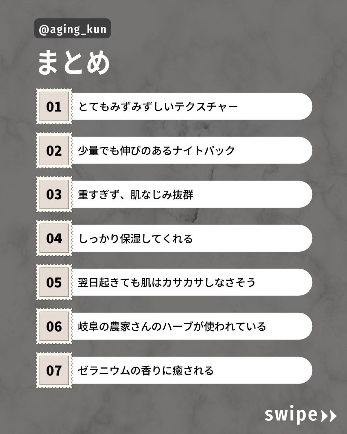 - 深眠肌*に導く、おやすみ前のうるおいケア。ローズゼラニウムのみずみずしい香りと、心地よいジェルクリームのテクスチャーで、おやすみ前のゆったりとした時間をお過ごしください。洗い流さないタイプのマスクです。 *ストレス(乾燥による)フリーな肌の状態