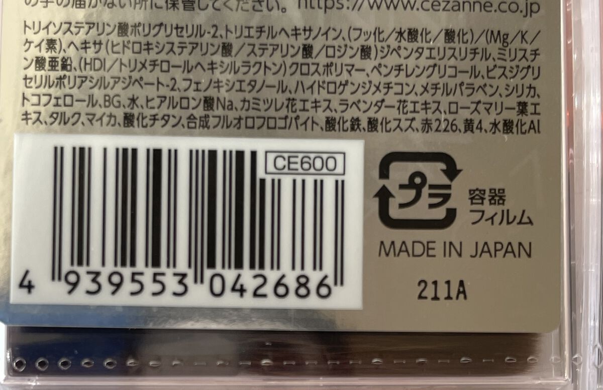 - <N1 コーラルシャワー> トリイソステアリン酸ポリグリセリル-2、トリエチルヘキサノイン、(フッ化/水酸化/酸化)/(Mg/K/ケイ素)、ヘキサ(ヒドロキシステアリン酸/ステアリン酸/ロジン酸)ジペンタエリスリチル、ミリスチン酸亜鉛、(HDI/トリメチロールヘキシルラクトン)クロスポリマー、ペンチレングリコール、ビスジグリセリルポリアシルアジペート-2、フェノキシエタノール、ハイドロゲンジメチコン、メチルパラベン、シリカ、トコフェロール、BG、水、ヒアルロン酸Na、カミツレ花エキス、ラベンダー花エキス、ローズマリー葉エキス、タルク、マイカ、酸化チタン、合成フルオロフロゴパイト、酸化鉄、酸化スズ、赤226、黄4、水酸化Al <N2 ライラックムード> トリイソステアリン酸ポリグリセリル-2、トリエチルヘキサノイン、(フッ化/水酸化/酸化)/(Mg/K/ケイ素)、ヘキサ(ヒドロキシステアリン酸/ステアリン酸/ロジン酸)ジペンタエリスリチル、ミリスチン酸亜鉛、(HDI/トリメチロールヘキシルラクトン)クロスポリマー、ペンチレングリコール、ビスジグリセリルポリアシルアジペート-2、フェノキシエタノール、ハイドロゲンジメチコン、メチルパラベン、シリカ、トコフェロール、BG、水、ヒアルロン酸Na、カミツレ花エキス、ラベンダー花エキス、ローズマリー葉エキス、タルク、合成フルオロフロゴパイト、酸化チタン、マイカ、グンジョウ、酸化スズ、酸化鉄、赤226、水酸化Al