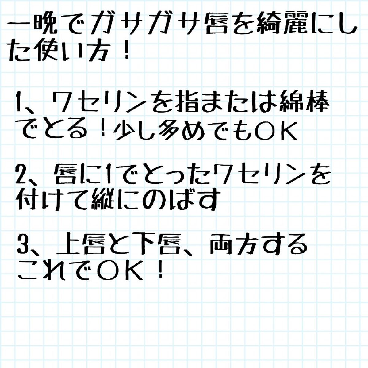 コスパ◎500円くらいで、たくさん入っている♡ 保湿力◎私の頑固なガサガサ唇を一晩で綺麗にした♡ 毎日続けてみると良いかも!忘れないように✨ 使い心地私は、◎指にワセリンをとって唇に塗ると唇がメッチャクチャ保湿されている感じ✨それが苦手な人は△かも、、、 匂い◎ワセリンは、無香料!でも、少し原料の匂いがするかな、、、 一晩でガサガサ唇を綺麗にした使い方! 1、ワセリンを指または綿棒でとる!少し多めでもOK🙆 2、唇に1でとったワセリンを付けて縦すじにそってのばす✨(縦すじにそって塗ると効果があるような気がするから♡) 3、上唇と下唇、両方する これでOK✴