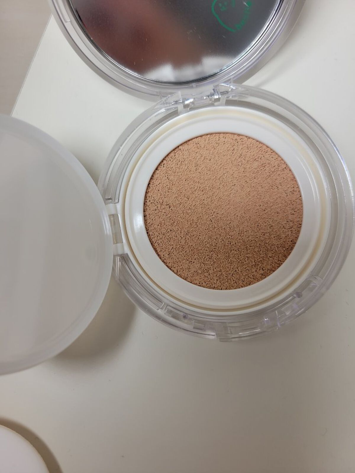 滑らかに簡単に塗れるし、全然崩れない! 色はピンク味が強くて暗すぎたり明るすぎたりもしない、セミマット〜セミツヤ?だけどなんとも言えない新しい質感だと思います! 陶器肌のようにとっても綺麗な肌に仕上げてくれるのに厚塗り感がない! 他の韓国クッションよりも色が全体的に暗めなので明るめを選んだほうがいいです〜! 崩れにくいし何よりいい香りがする! 柑橘っぽい匂いに感じます。これは喫茶店コレクション?の限定ケースだけど、普通のケースもネイビーで可愛いです^_^
