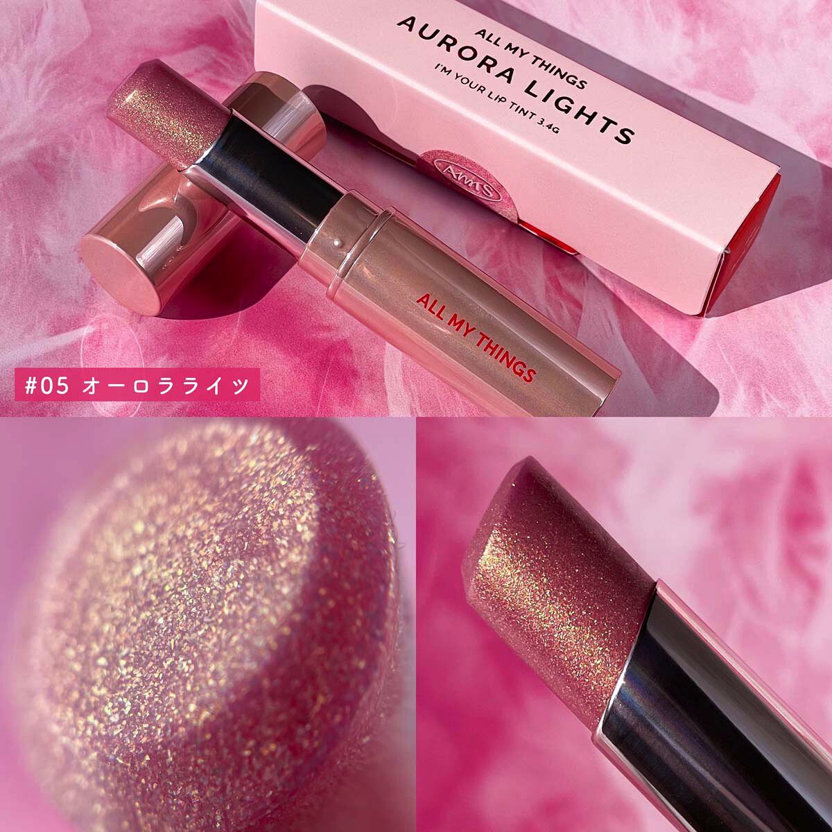 。.ꕤ‿allmythingsアイムユアリップティント‿ꕤ.。05オーロラライツピンクローズラメ✕ゴールドラメがかわいいリップティントです!公式写真で見たよりも青みピンクでしたが、発色は控えめなのでPC問わず使いやすそうです。重ね塗りするとし...