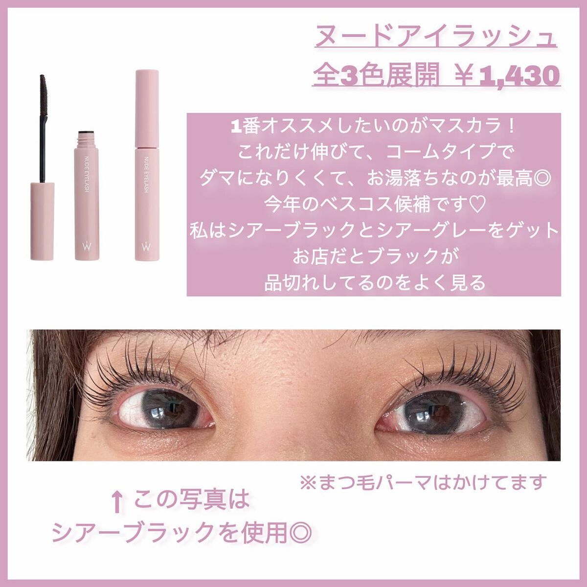 ヌードアイラッシュはコームタイプで塗りやすくて好きです❣️ WonjungyoはTWICEのメイクさんのブランドだけど、このマスカラは日本製だから韓国には無いアイテムなんですかね?? たしかにかなり薄い発色!! 今回ディープブラウン品切れだったけど、一重の薄顔にはやっぱりディープブラウンの方が盛れるかも🥺 メガ割対象外だったけどマスカラ無くなったら嫌なので購入〜 今使っているのはディープブラウンですが、結構濃いのでシアーブラウンにしてみました!
