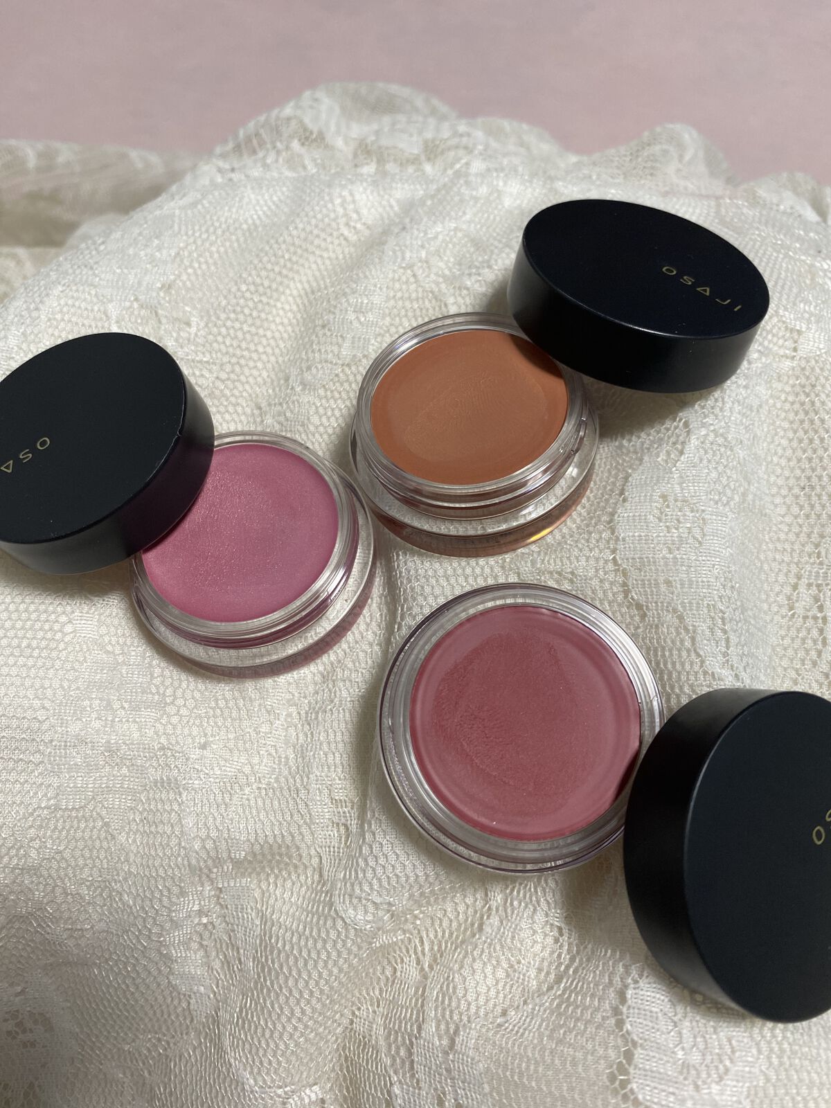 しっかりめに指塗り。 03、04は薄付きでツヤが綺麗なパール系 07、08は↑よりしっかり発色する色違いみたいな感じ 目元、頬、唇どこにでも使える出番が多いのが08ことづて 持ち運びしてることも多くてお気に入り。 ブラウンチーク似合わなさすぎて諦めかけてた時に発売になった02核心は、私がOSAJI製品を本格的にものすごーーーく愛用するようになったきっかけでもある