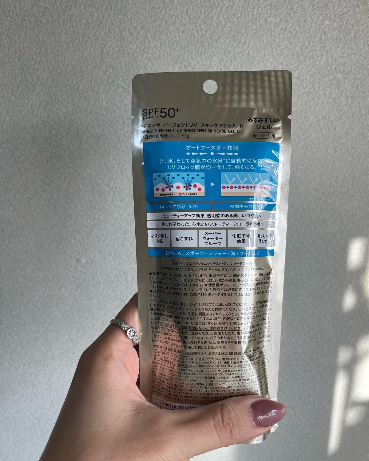 - SPF50+ ・ PA++++ 顔・ から だ用 汗、水、そして空気中の水分※10 に反応してUVブロック膜が強くなる技術搭載 毎日つけたくなる みずみずしいスキンケア UVジェル ※10 暑い時期の高湿度環境 〇汗、水、そして空気中の水分に自動的に反応して 、 UVブロック膜が 強くなります 。-オートブースタ ー 技術 〇透明美肌仕上げ-ビューティ ー アップ 〇スキンケア成分50%配合 〇保湿成分:コラーゲン、スーパーヒアルロン酸※9、グリセリン ※9 アセチルヒアルロン酸Na 〇長時間保湿持続効果 〇スーパーウォータープルーフ 〇マスク蒸れ対応 〇耐こすれ 〇化粧下地効果 〇せっけんで落とせる 〇みずみずしいジェル 〇生まれ変わった、心地よいフルーティーフローラルの香り 〇大気中に浮遊する微粒子、PM2.5などから肌を保護します。 -微粒子付着防止対応 〇海に流れ出にくいオーシャンフレンドリー処方※6 ※6 自社品内の耐水処方でない商品と比較 〇植物由来の原料を一部使用した袋 〇無着色・ノンコメドジェニックテスト・アレルギーテスト済み (全ての方にニキビができない、アレルギーが起きないというわけではありません)