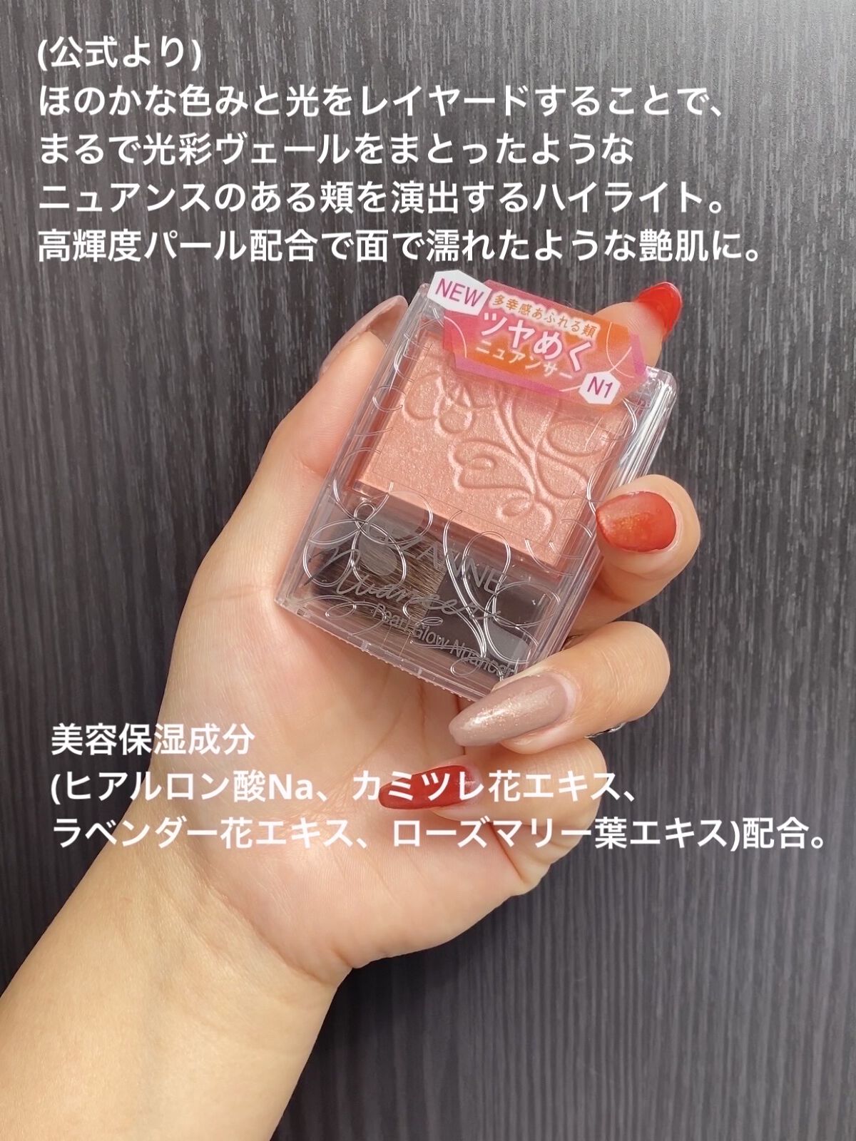 - <N1 コーラルシャワー> トリイソステアリン酸ポリグリセリル-2、トリエチルヘキサノイン、(フッ化/水酸化/酸化)/(Mg/K/ケイ素)、ヘキサ(ヒドロキシステアリン酸/ステアリン酸/ロジン酸)ジペンタエリスリチル、ミリスチン酸亜鉛、(HDI/トリメチロールヘキシルラクトン)クロスポリマー、ペンチレングリコール、ビスジグリセリルポリアシルアジペート-2、フェノキシエタノール、ハイドロゲンジメチコン、メチルパラベン、シリカ、トコフェロール、BG、水、ヒアルロン酸Na、カミツレ花エキス、ラベンダー花エキス、ローズマリー葉エキス、タルク、マイカ、酸化チタン、合成フルオロフロゴパイト、酸化鉄、酸化スズ、赤226、黄4、水酸化Al <N2 ライラックムード> トリイソステアリン酸ポリグリセリル-2、トリエチルヘキサノイン、(フッ化/水酸化/酸化)/(Mg/K/ケイ素)、ヘキサ(ヒドロキシステアリン酸/ステアリン酸/ロジン酸)ジペンタエリスリチル、ミリスチン酸亜鉛、(HDI/トリメチロールヘキシルラクトン)クロスポリマー、ペンチレングリコール、ビスジグリセリルポリアシルアジペート-2、フェノキシエタノール、ハイドロゲンジメチコン、メチルパラベン、シリカ、トコフェロール、BG、水、ヒアルロン酸Na、カミツレ花エキス、ラベンダー花エキス、ローズマリー葉エキス、タルク、合成フルオロフロゴパイト、酸化チタン、マイカ、グンジョウ、酸化スズ、酸化鉄、赤226、水酸化Al