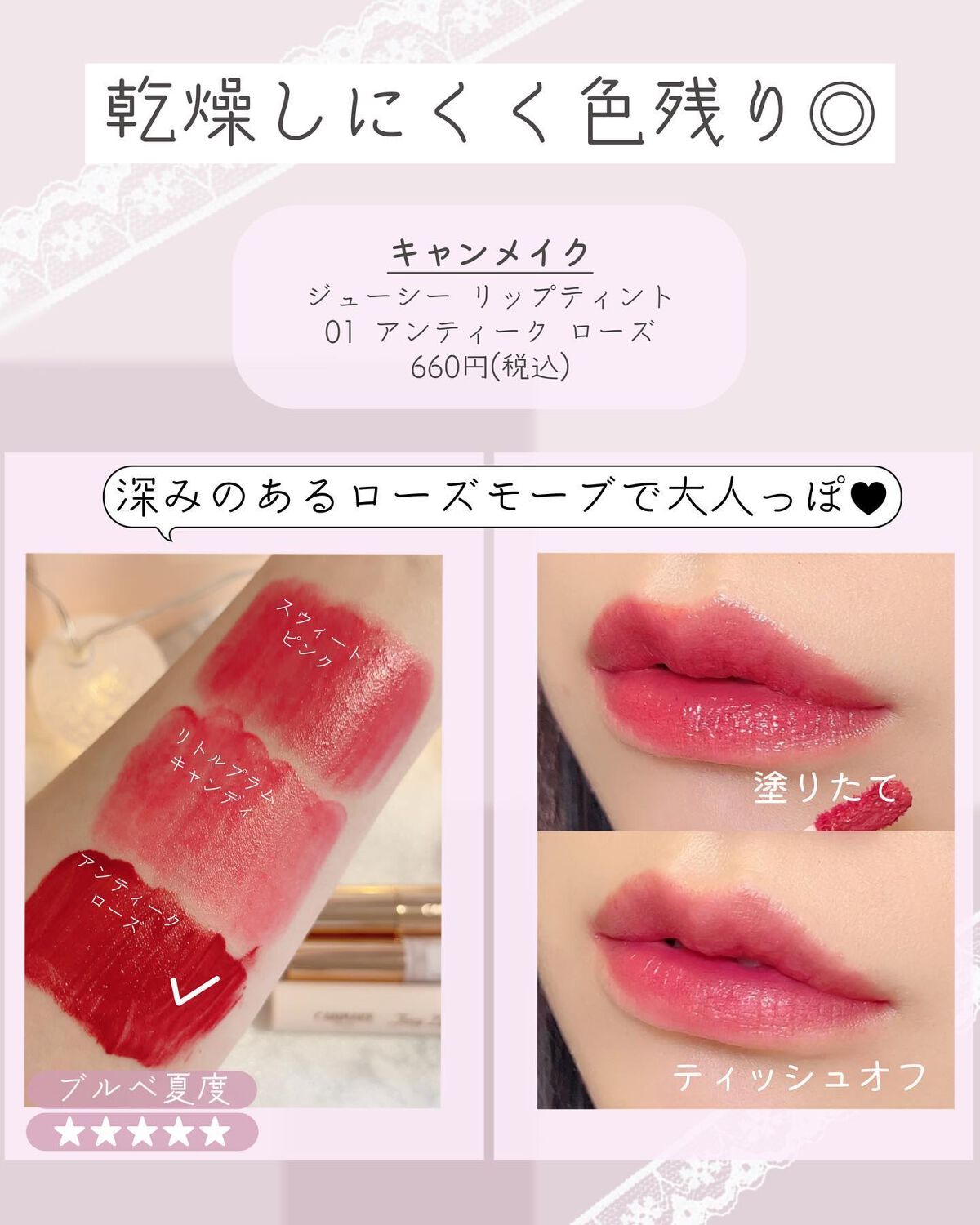 | 口紅・グロス・リップライナーランキング第58位 | ほんのりフルーツみたいな良い香りがします🍎 付けた感じのテクスチャーはぷるもち系ですね | 詳細を見る | |