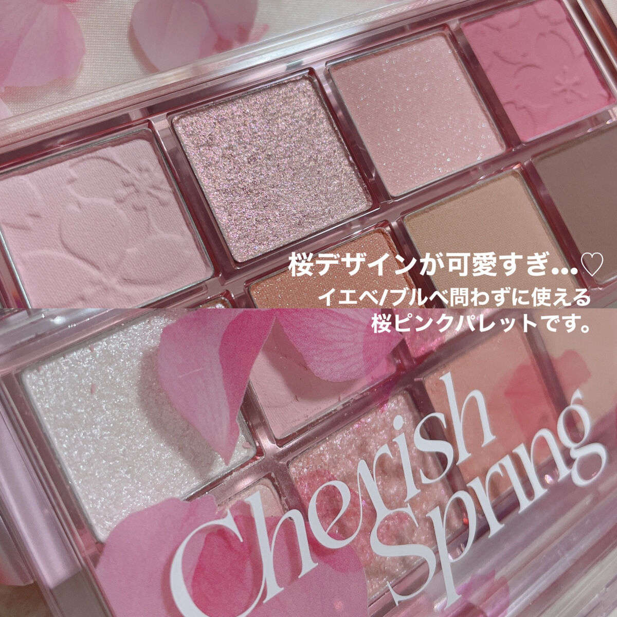 暖かい春の日差しに咲いた桜の花びらの華やかさを盛り込んだイエベさんにおすすめ桜アイシャドウ テクスチャーも4種類あって使いやすい ✔︎︎︎︎マット ✔︎︎︎︎マットパール ✔︎︎︎︎グリッター ✔︎︎︎︎湿式グリッター 可愛すぎるし期間限定だしとりあえず買うしかないよね💕︎