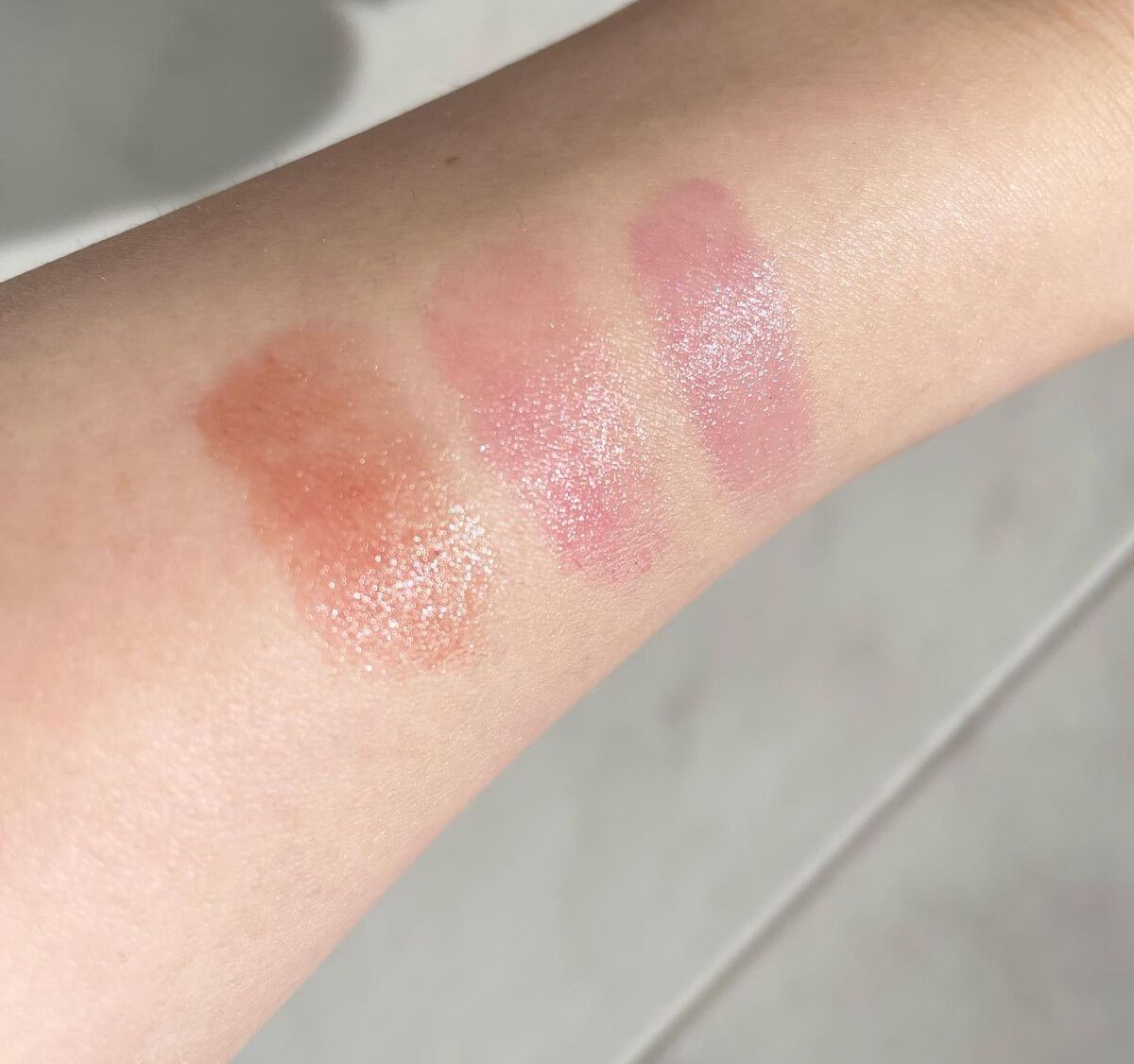 60%以上がウォーターベースなのでしっとりとした着け心地♡ さらにパール表面に貴金属コーティングをしているため全ての角度で同じ反射効果があります✨ チップを使って塗るので簡単で、手が汚れなくて便利👏🏻 とにかく使用感が良くてしっとりとしていて、密着度が高い✨ みずみずしい使い心地です。 ラメが飛ぶこともありませんでしたよ◎ キラッキラで、綺麗な輝き🥺💓 ピーチライトはお肌に馴染みやすい色味でとても使いやすいです♪ 上品なグリッターで、毎日大活躍中です🍑
